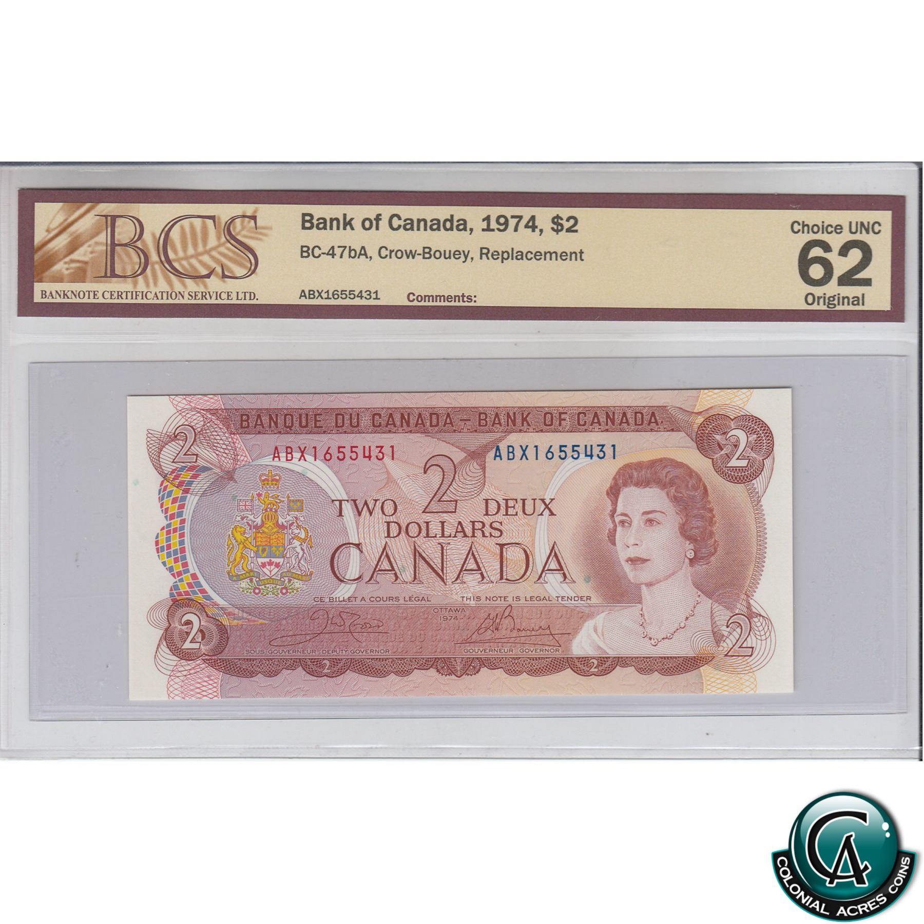 BC-47bA 1974 Bank of Canada Replacement $2, Crow-Bouey, S/N: ABX1655431 BCS Certified CUNC-62 Original.