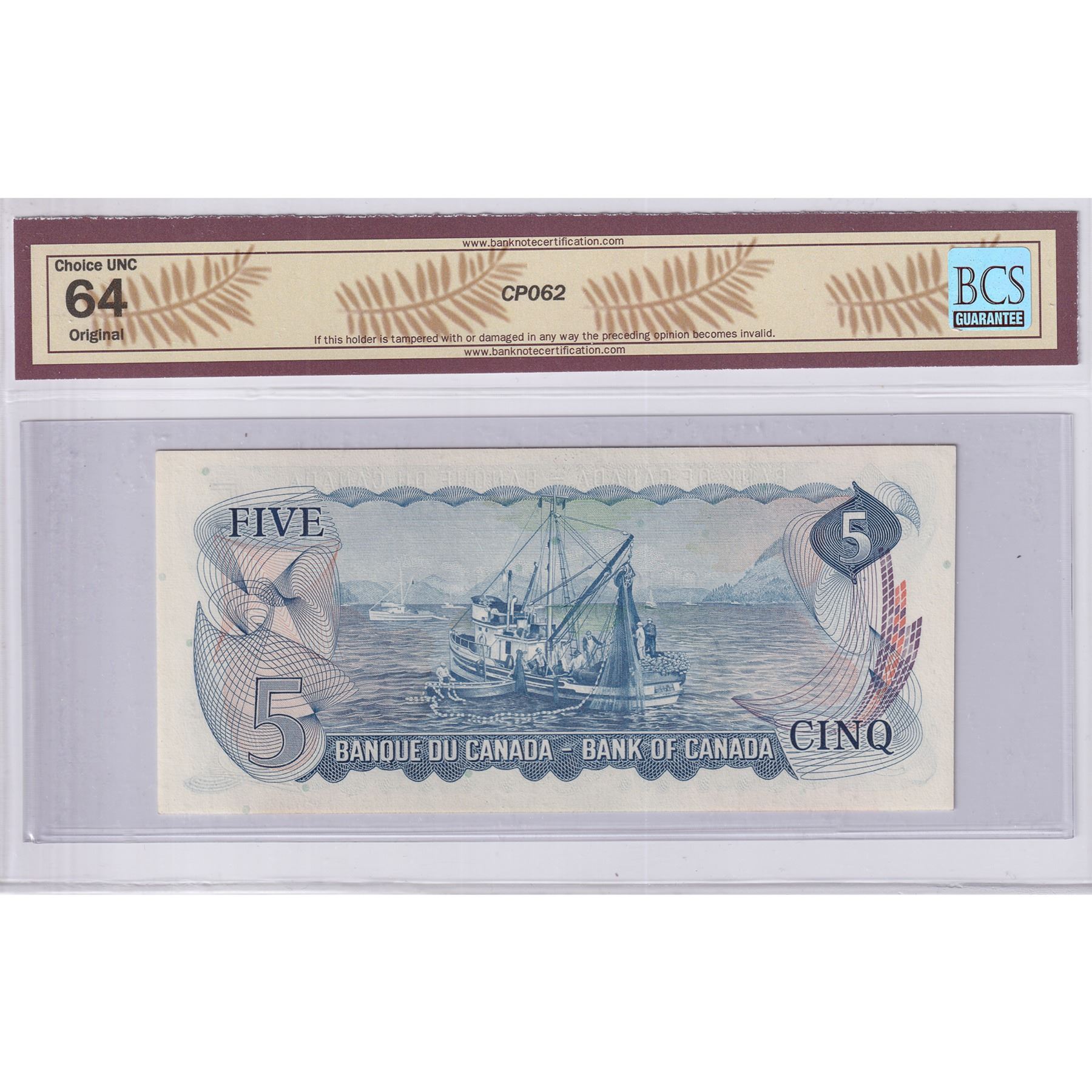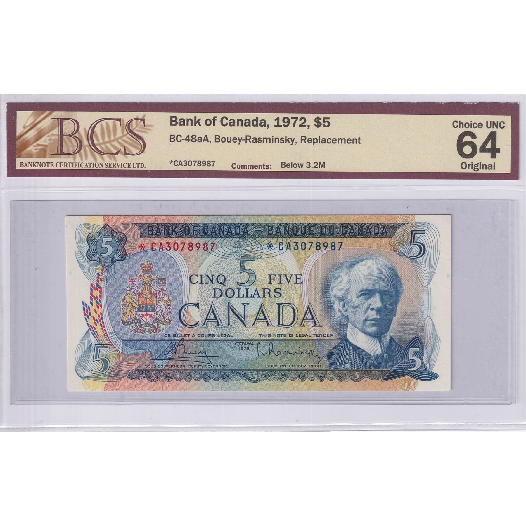 BC-48aA 1972 Bank of Canada Replacement $5, Bouey-Rasminsky S/N: *CA3078987, BCS Certified CUNC-64 Original