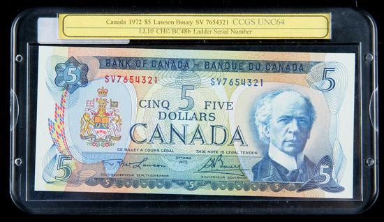 BC-48b 1972 $10. Canadian Currency Grading Service UNC64. This "down ladder" note bears serial number SV7654321.