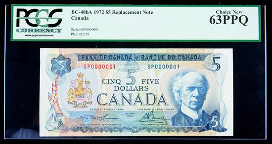 BC-48b 1972 $5. PCGS Choice New 63PPQ. Serial number SP0000001.