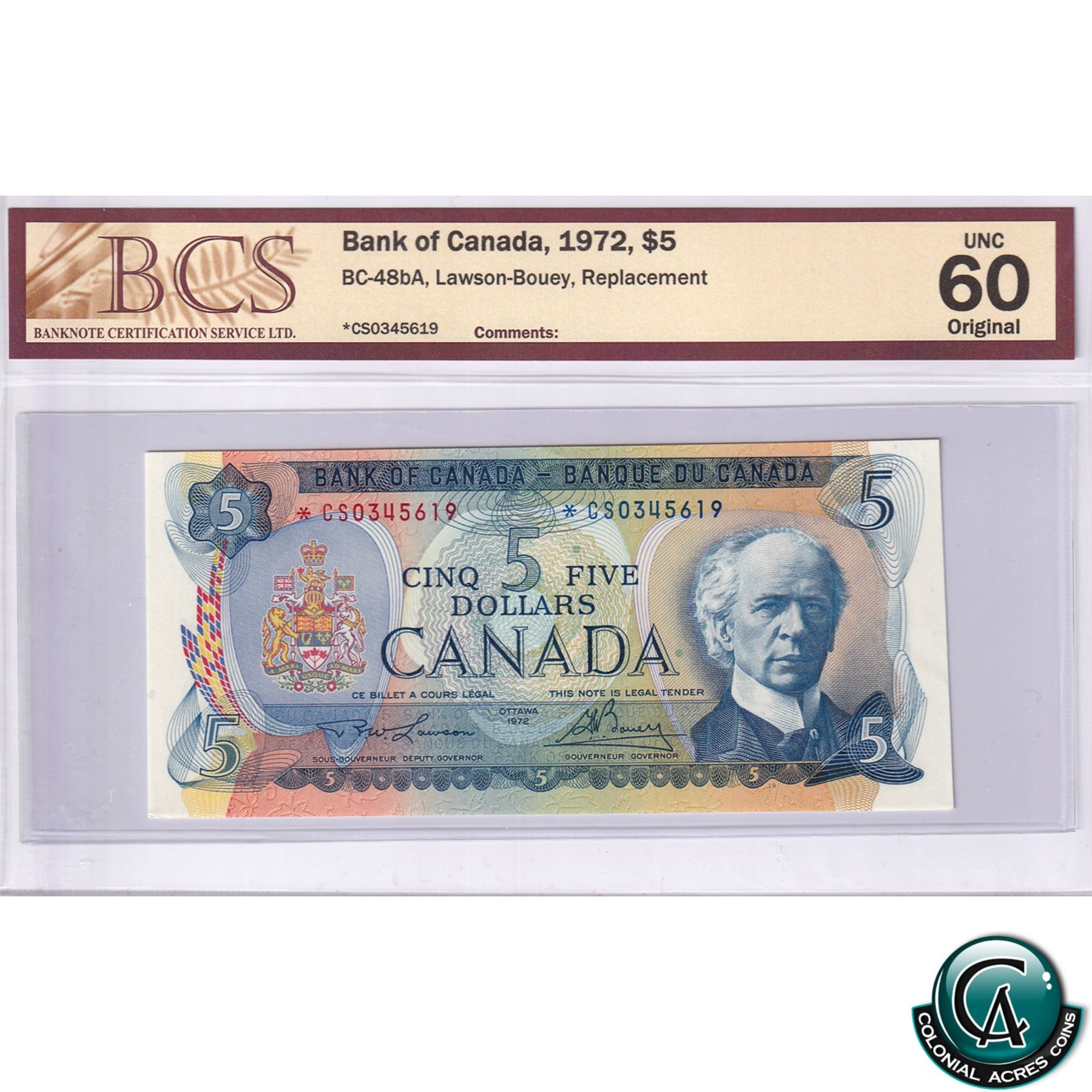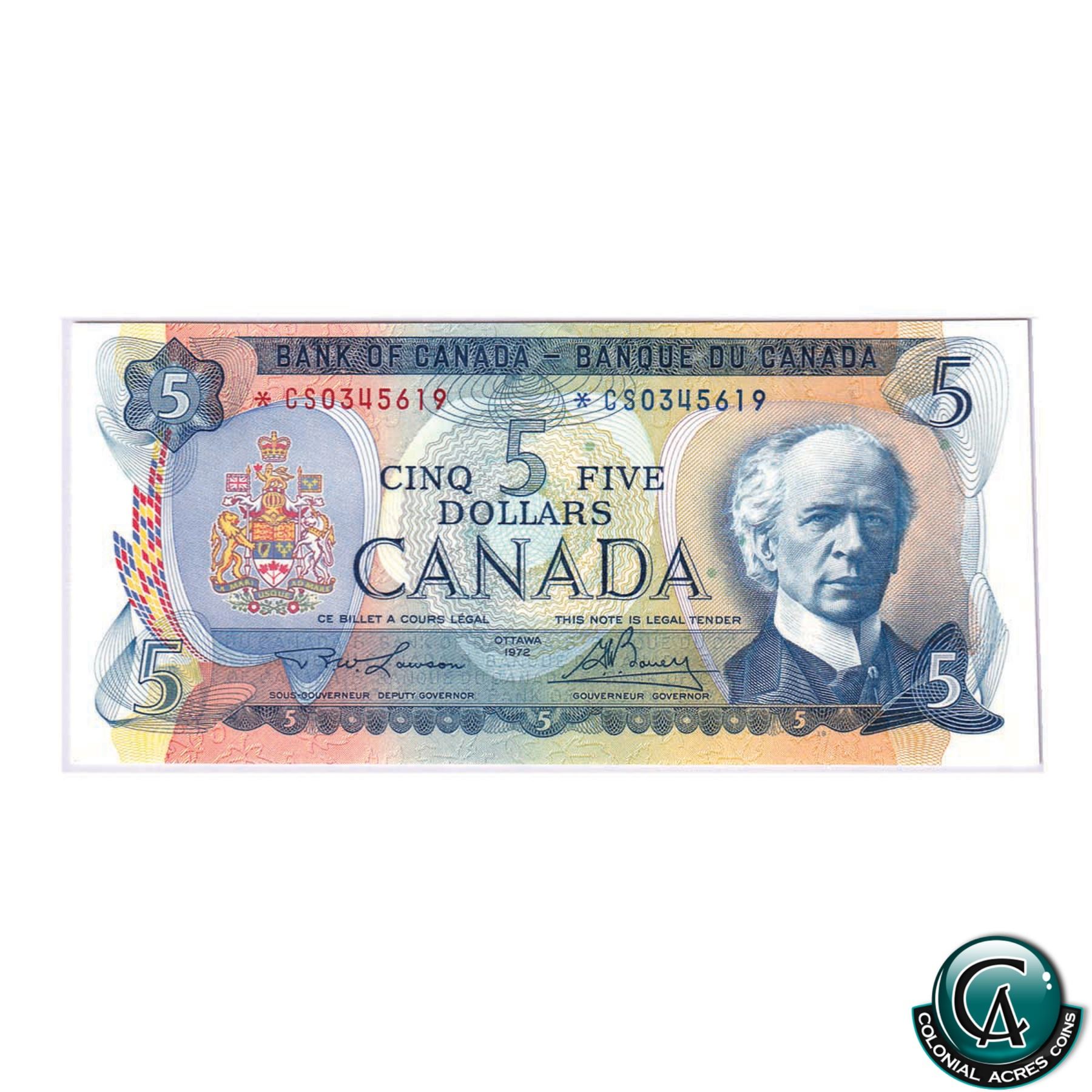 BC-48bA 1972 Bank of Canada Replacement $5, Lawson-Bouey, S/N: *CS0345619 BCS UNC-60 Original