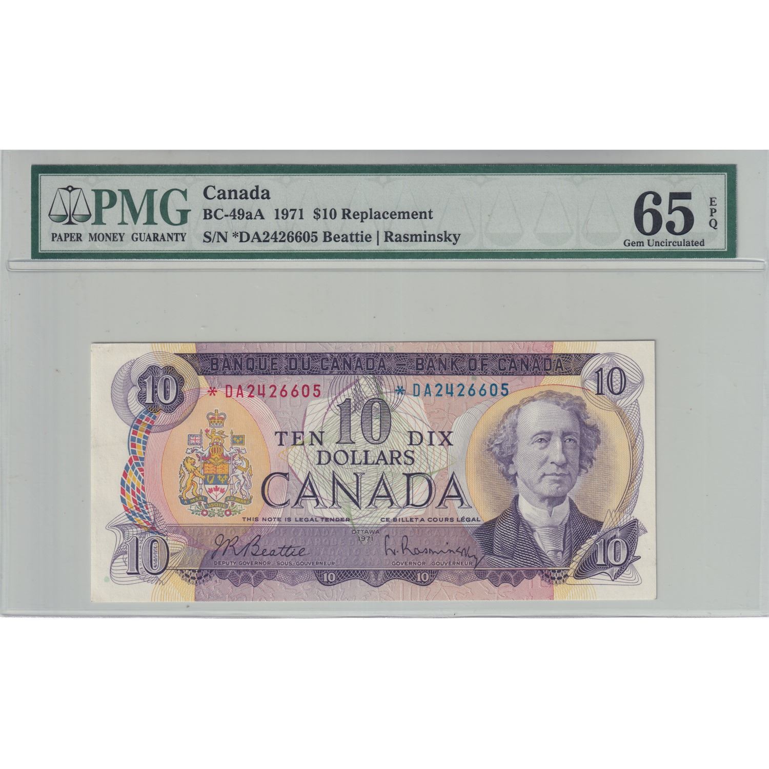 BC-49aA 1971 Canada $10, Beattie-Rasminsky, Replacement, SN: *DA2426605, PMG Certified Gem UNC-65 EPQ