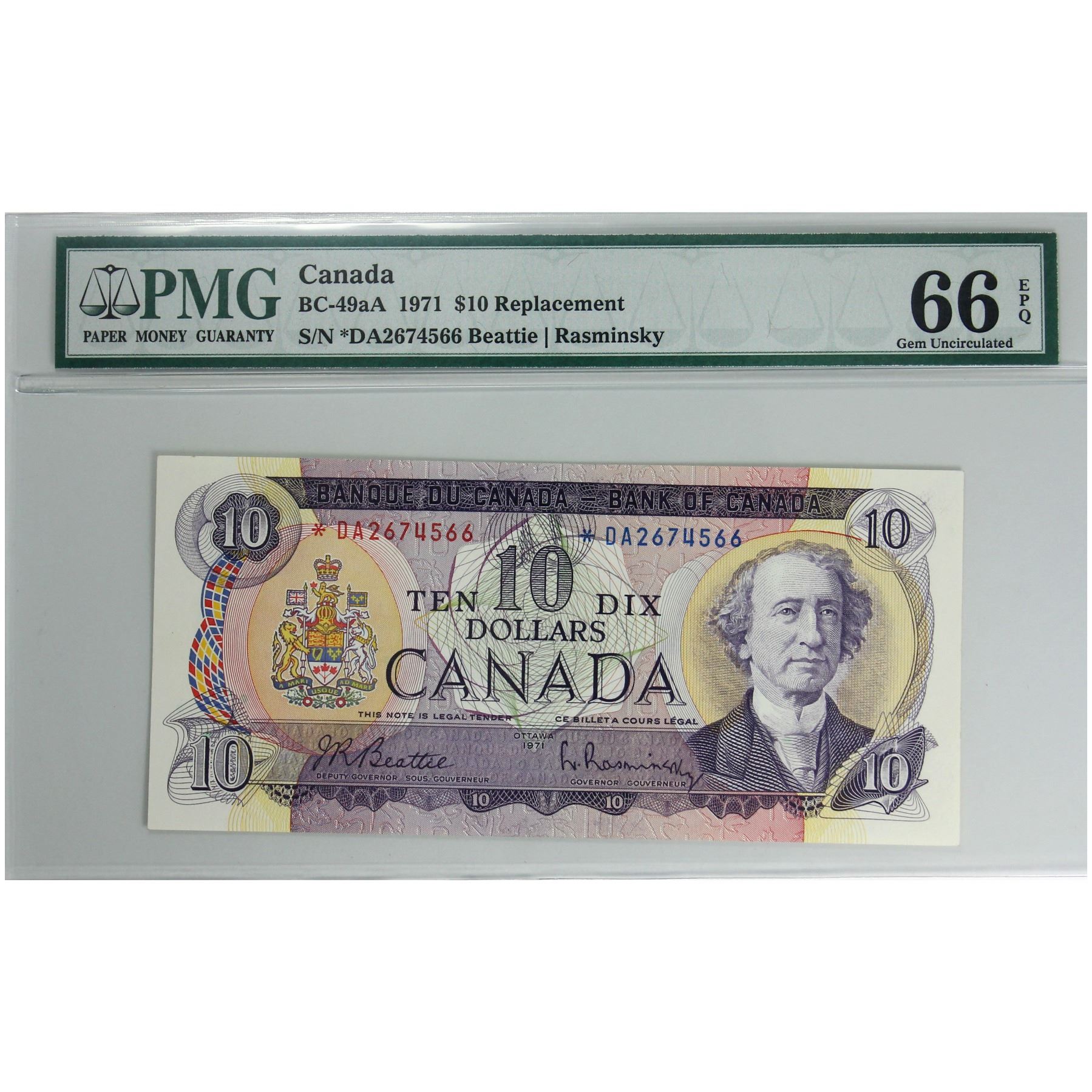 BC-49aA 1971 *DA $10 PMG GEM UNC66 EPQ Beattie-Rasminsky Replacement S/N: *DA2674566