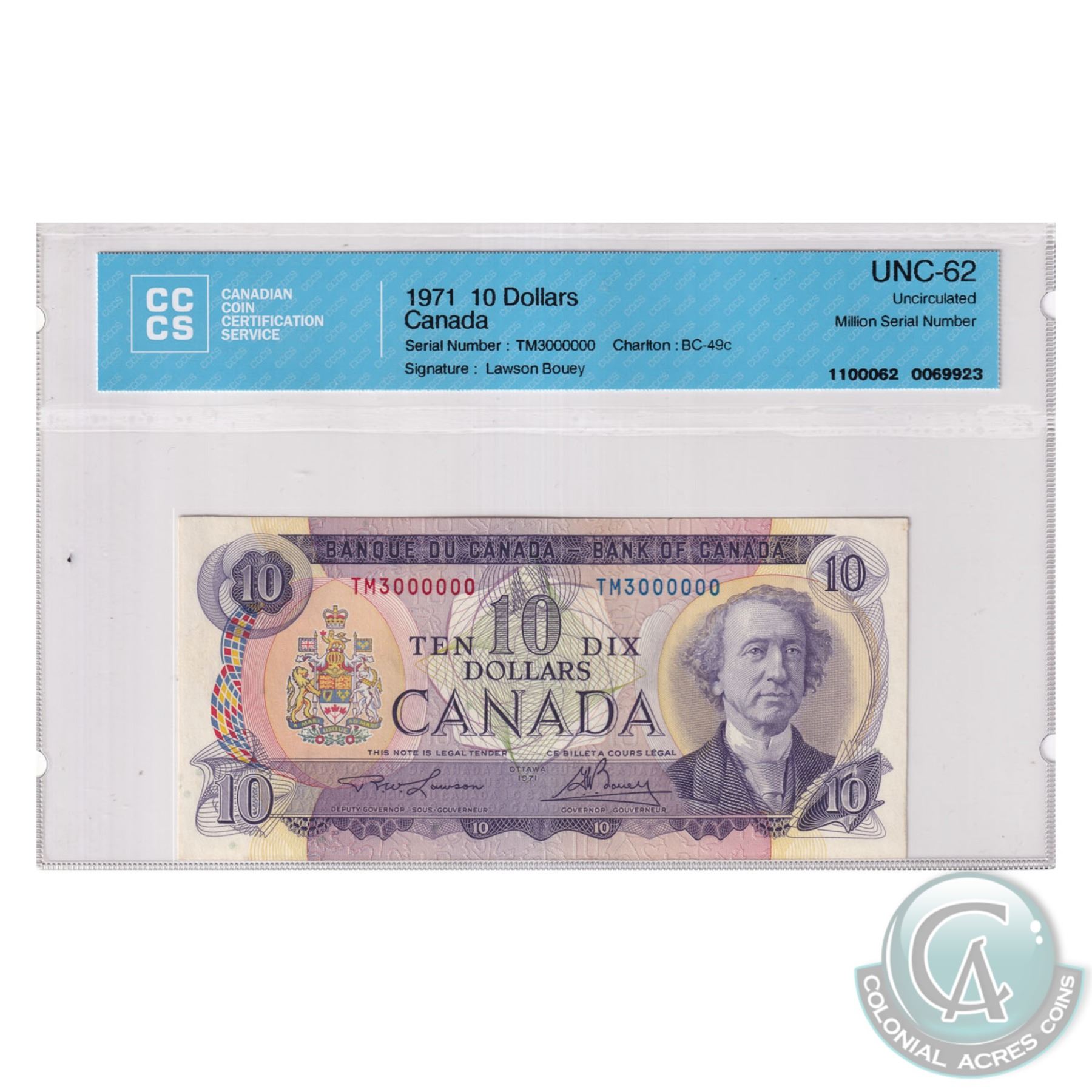 BC-49c 1971 Bank of Canada $10, Million Number Note. Lawson-Bouey, S/N: TM3000000. CCCS Certified UNC-62!
