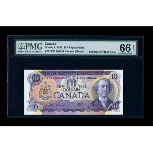 <B>BC-49cA $10 1971</B></I><BR> This was one of the last of the asterisk replacement notes before the decision to go to a three letter replacement code was implemented in 1981. PMG <B>Gem Uncirculated 66 EPQ, </B></I>a near perfect example. <BR><I>From The Thomas M. Flynn Collection</B></I><BR><BR><b>Shipping:</b> Coins & Currency (<a target="_blank" href="http://www.heritageauctions.com/common/shipping.php">view shipping information</a>)