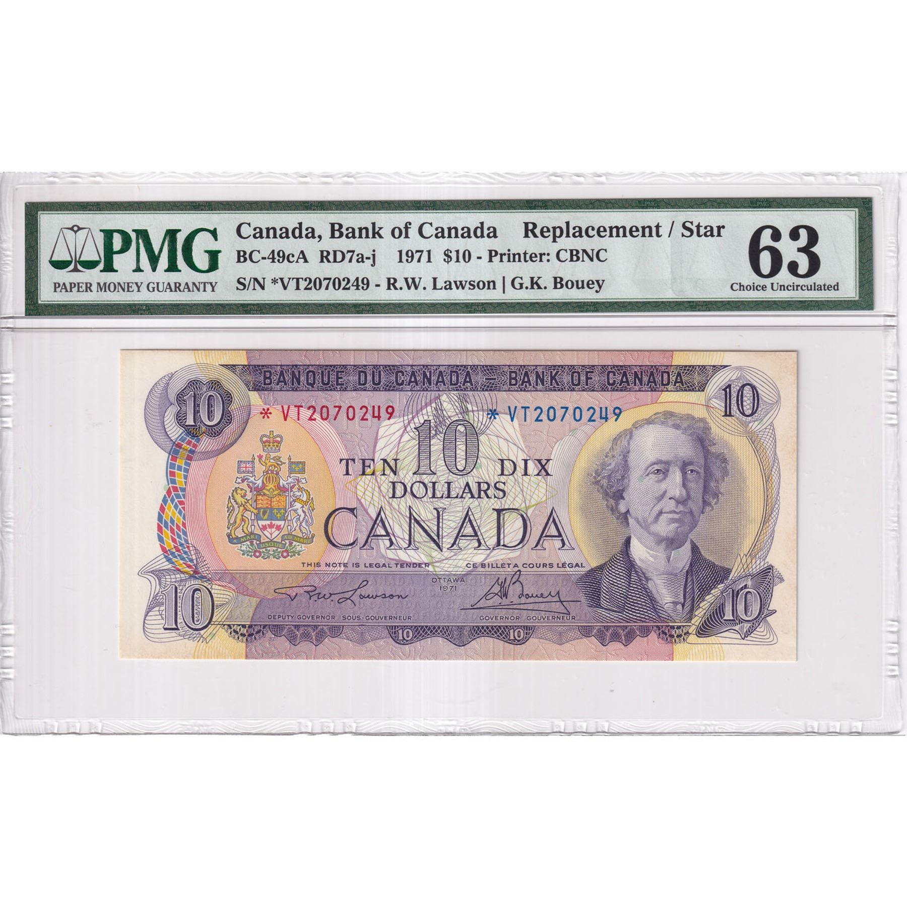 BC-49cA 1971 Bank of Canada Replacement $10, Lawson-Bouey S/N: *VT2070249, PMG Certified Choice UNC-63