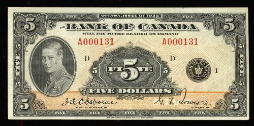 BC-5 1935 $5 English text "LOW SERIAL" #A000131 A superb VF to VF+ example. A very scarce and seldom offered note.