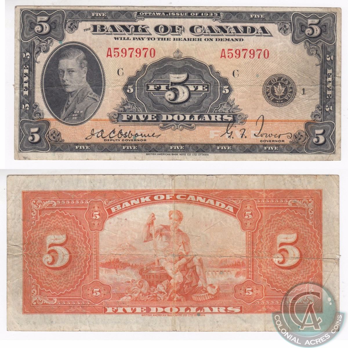 BC-5. 1935 Bank of Canada $5, Osborne-Towers, S/N: A597970/C in Fine condition. The note has a minor tear along the left margin.