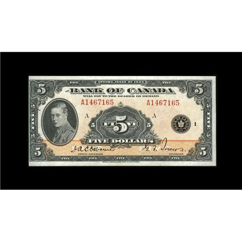 <B>BC-5 $5 1935</B></I><BR>A very bright English Text $5 note from the Halton Lake collection. <B>Crisp Uncirculated,</B></I> with the left margin very close.<BR><I>From The Halton Lake Collection</B></I>