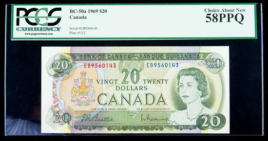 BC-50a 1969 $20. Three Examples. PCGS Choice About New 58PPQ. Three lovely examples of the 1969 issue, the first two consecutive and the third separated by just two numbers. Each has a single light center bend that limits the technical numeric grade but does not inhibit the tremendous eye appeal. Lot of 3 notes.