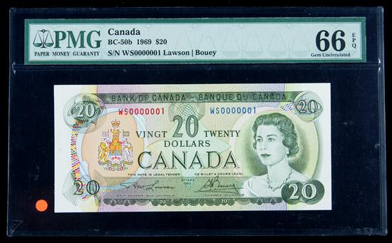 BC-50b 1969 $20. PMG Gem Uncirculated 66EPQ. Serial number WS0000001, a lovely Gem example of the first note printed from this serial block run.