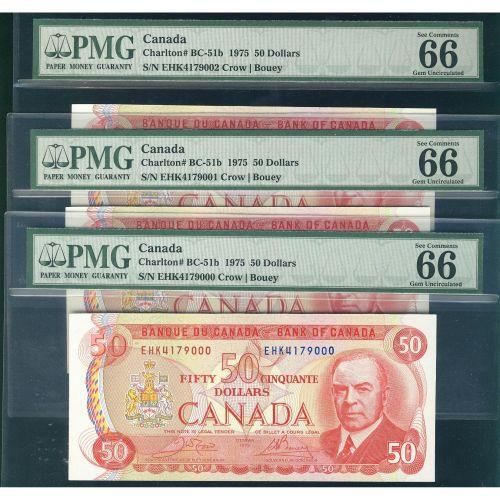 BC-51b, 1975 $50 PMG UNC66. Lot of three consecutive Gem notes. #EHK4179000 to #EHK4179002