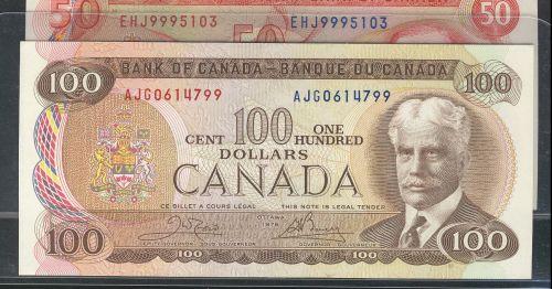 BC-51b 1975 $50 and BC-52b 1975 $100 both with Crow-Bouey signatures. AU to UNC