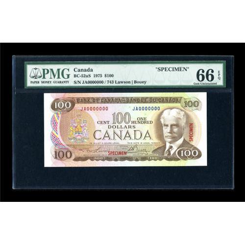 <B>BC-52aS $100 1975 Specimen</B></I><BR> This wonderful specimen from set 743 has garnered the elusive grade of <B>PMG Gem Uncirculated 66 EPQ</B></I>.<BR><BR><b>Shipping:</b> Coins & Currency (<a target="_blank" href="http://www.heritageauctions.com/common/shipping.php">view shipping information</a>)