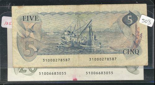 BC-53aA 1979 $5 31000278587 Lawson-Bouey Fine, BC-54cA 1979 $20 51006683055 Thiessen-Crow AU+ light red mark.