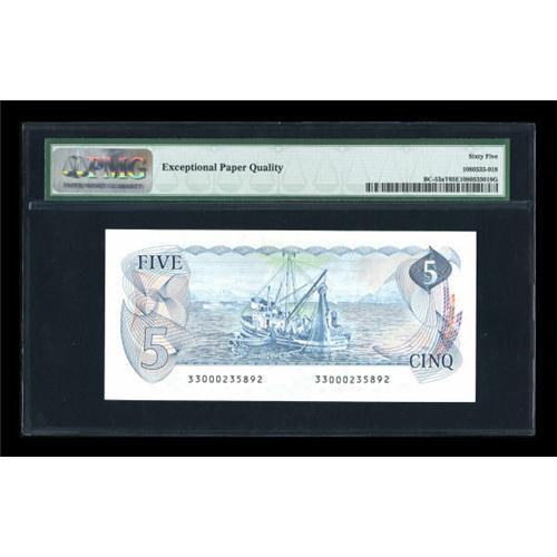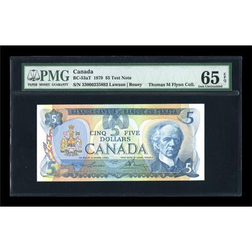 <B>BC-53aT $5 1979</B></I><BR> This Test Note, which is denoted by its serial number beginning with "33," is one of the great late day Canadian rarities. While an estimated 500,000 were produced, they were released without public comment, entering the normal channels of commerce and circulating without collector attention. As a result, only a literal handful are known in all grades today, with uncirculated examples prohibitively scarce. PMG has graded five examples of this rarity to date, three mid-grade circulated specimens, one Gem 66 (which resides in a major US holding), and this piece from the Flynn collection, a beauty which is now ensconced in a PMG <B>Gem Uncirculated 65 EPQ </B></I>holder. we do not know what this note will realize today, but whatever the number, it likely will appear inexpensive tomorrow.<BR><I>From The Thomas M. Flynn Collection</B></I><BR><BR><b>Shipping:</b> Coins & Currency (<a target="_blank" href="http://www.heritageauctions.com/common/shipping.php">view shipping information</a>)