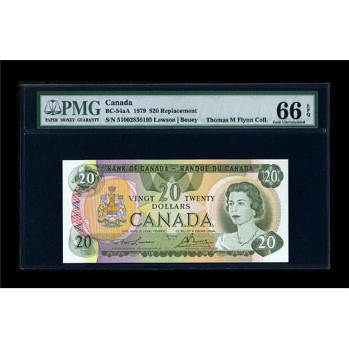 <B>BC-54aA $20 1979</B></I><BR> A gorgeous example of the first replacement notes issued in thus series. Few if any certified examples will turn out to be nicer than the Flynn specimen. PMG <B>Gem Uncirculated 66 EPQ.</B></I><BR><I>From The Thomas M. Flynn Collection</B></I><BR><BR><b>Shipping:</b> Coins & Currency (<a target="_blank" href="http://www.heritageauctions.com/common/shipping.php">view shipping information</a>)