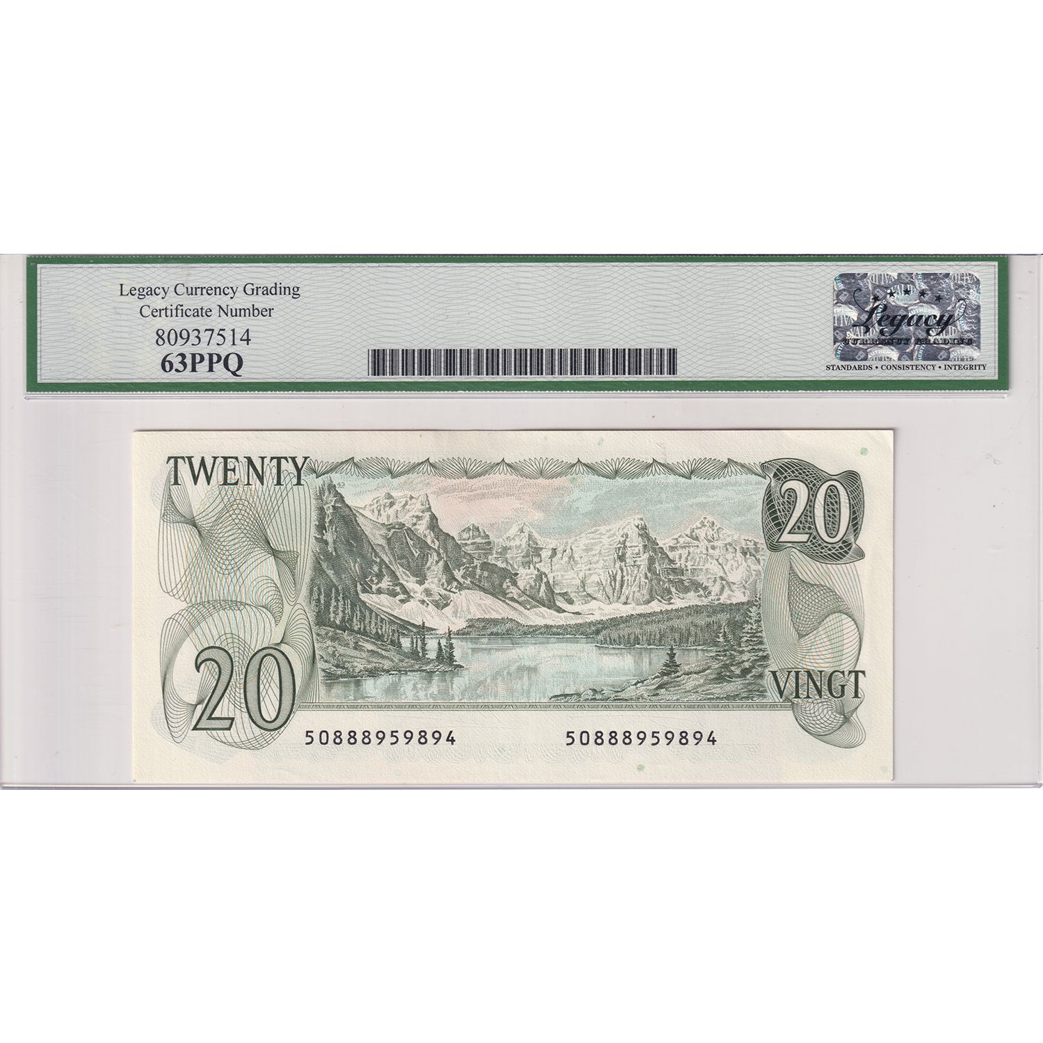 BC-54b 1979 $20 Legacy UNC63 PPQ Crow-Bouey CBN, Engraved Back SN: 50888959894
