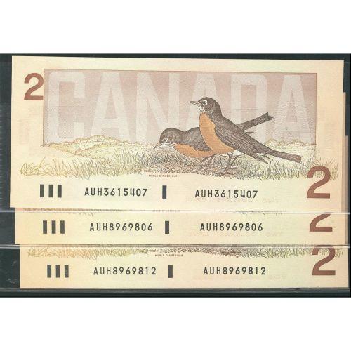 BC-55a, 1986 $2 #AUH3615407, 8969806 and 8969812 UNC, Lot of three notes all UNC