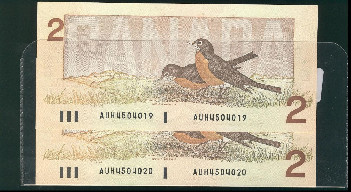 BC-55a, 1986 $2 #AUH4504019 to 020 UNC, two consecutive note