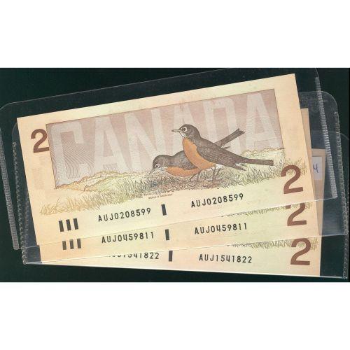 BC-55a, 1986 $2 #AUJ0208599, 0459811 & 1541822 UNC. Lot of three notes.