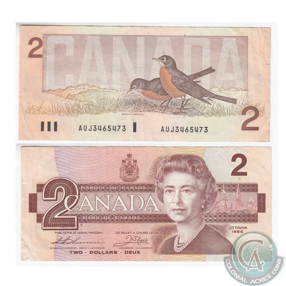 BC-55b. 1986 Bank of Canada Changeover $2, Thiessen-Crow, S/N: AUJ3465473 in VF Condition. A problem free example of a scarce changeover.