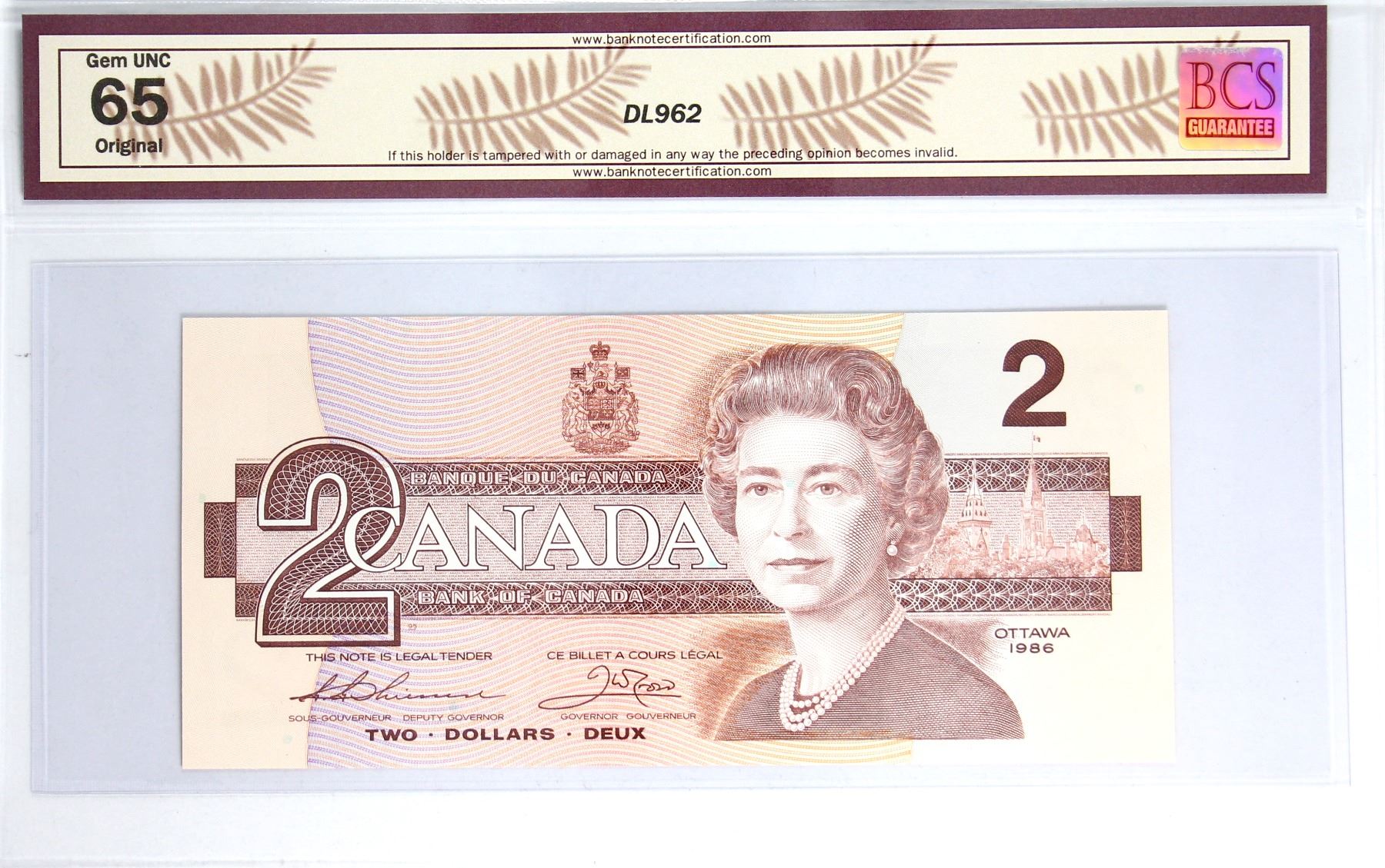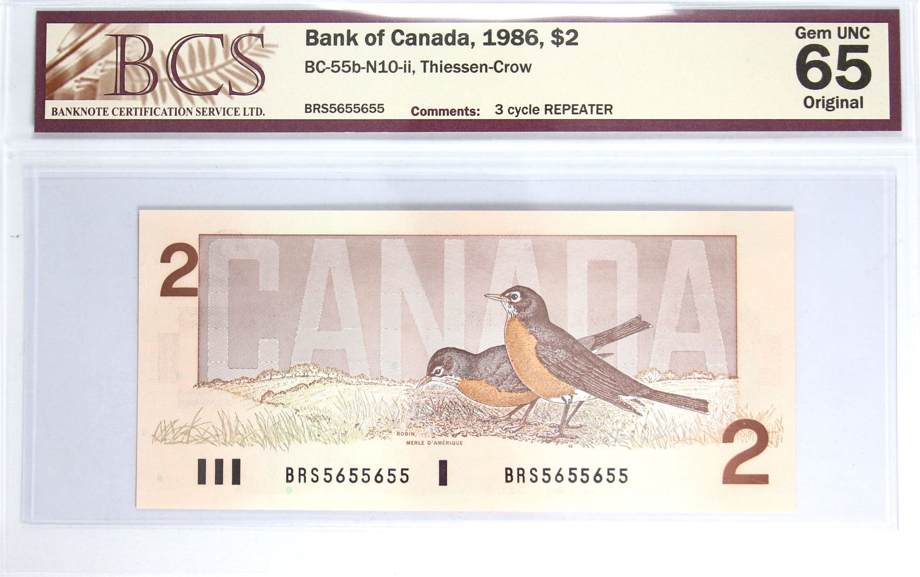 BC-55b-N10-ii 1986 Canada $2, Thiessen-Crow, SN:BRS5655655, BCS Certified Banknote in Gem UNC-65 Original Condition.