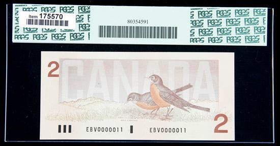 BC-55b-i 1986 $2. PCGS Superb Gem New 67PPQ. Serial number EBV0000011, the first of three consecutive.