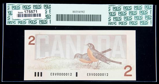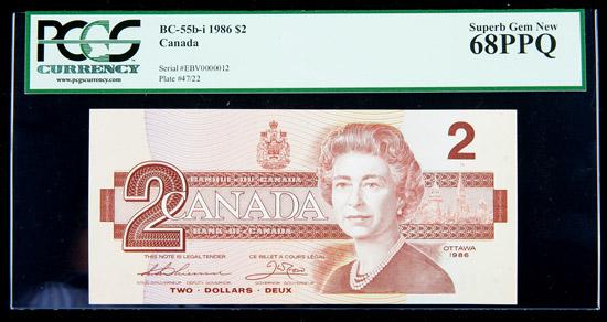 BC-55b-i 1986 $2. PCGS Superb Gem New 68PPQ. Serial number EBV0000012, the second of three consecutive.