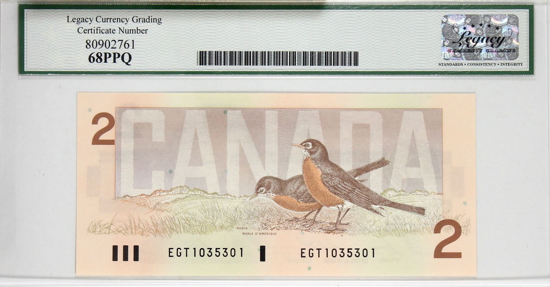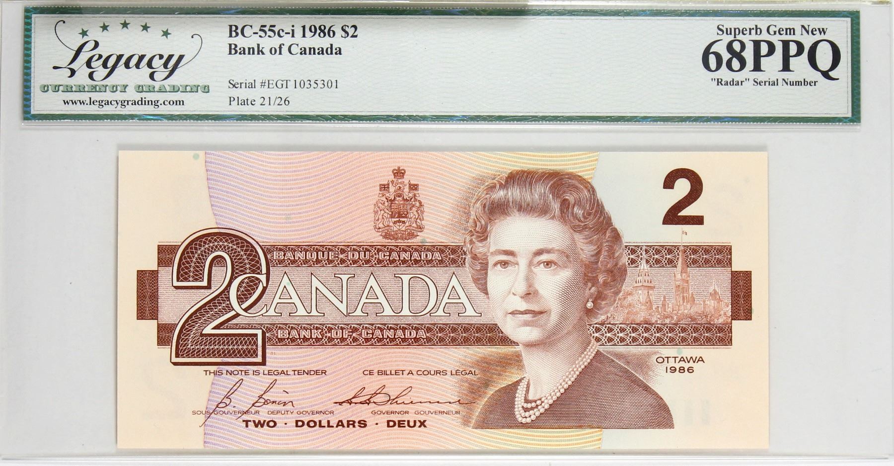 BC-55c-I 1986 Bank of Canada $2, 4 Digit Radar, Bonin-Thiessen S/N: EGT1035301, Legacy Certified Superb Gem New-68 PPQ!