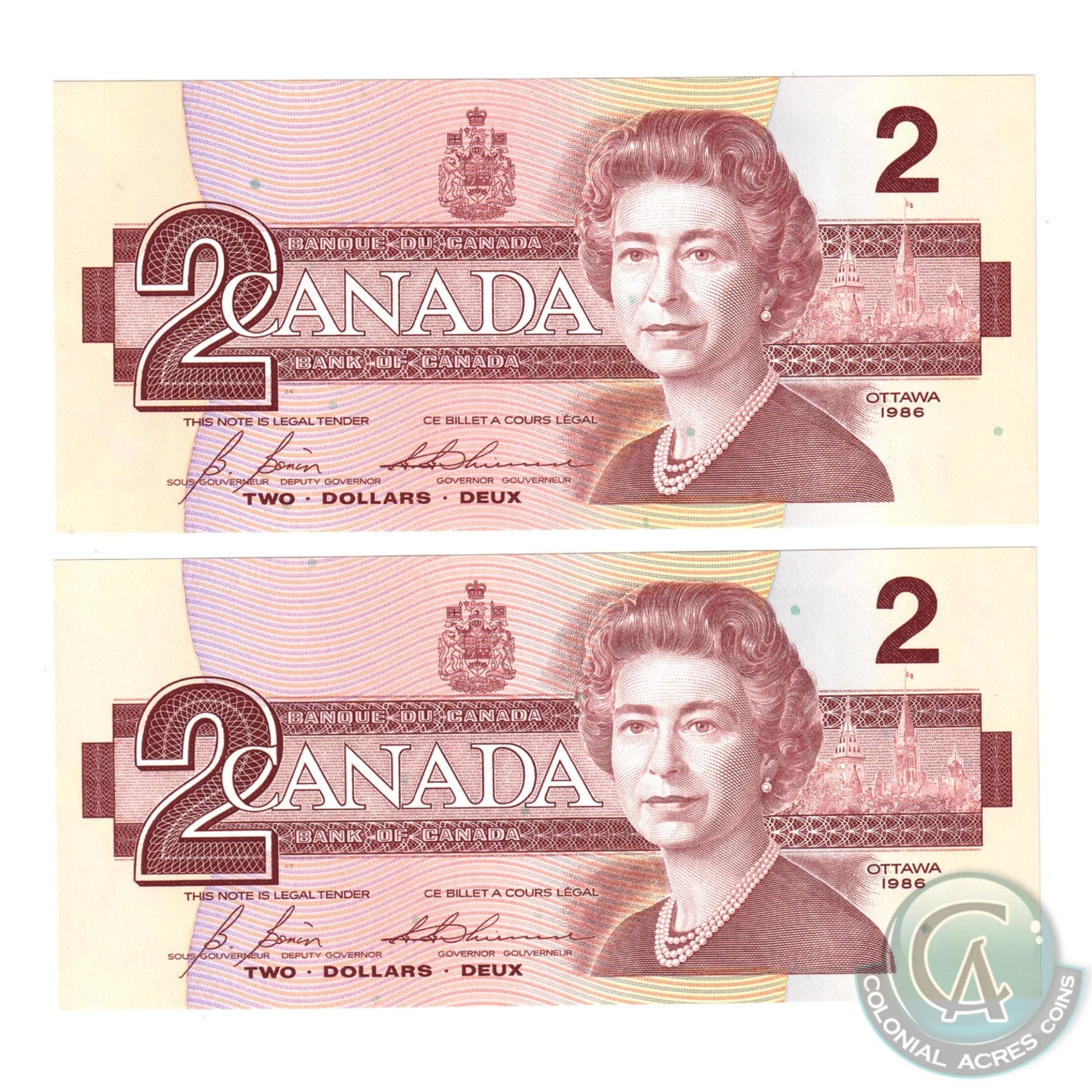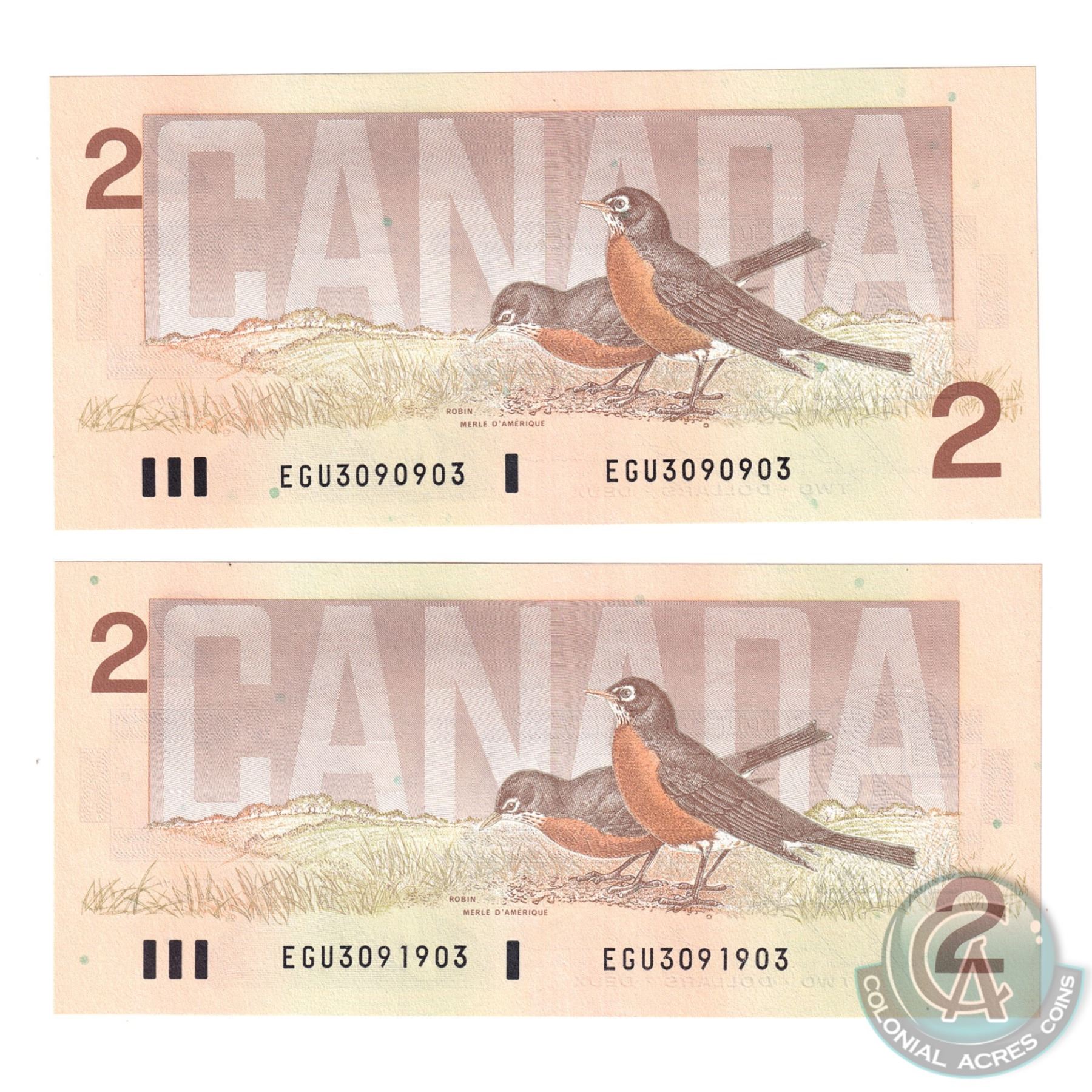BC-55c-I, 2x 1986 Bank of Canada $2 Radar notes, Bonin-Theissen S/N: EGU3090903 & EGU3091903, both Notes CUNC. A Unique Pair! 2pcs