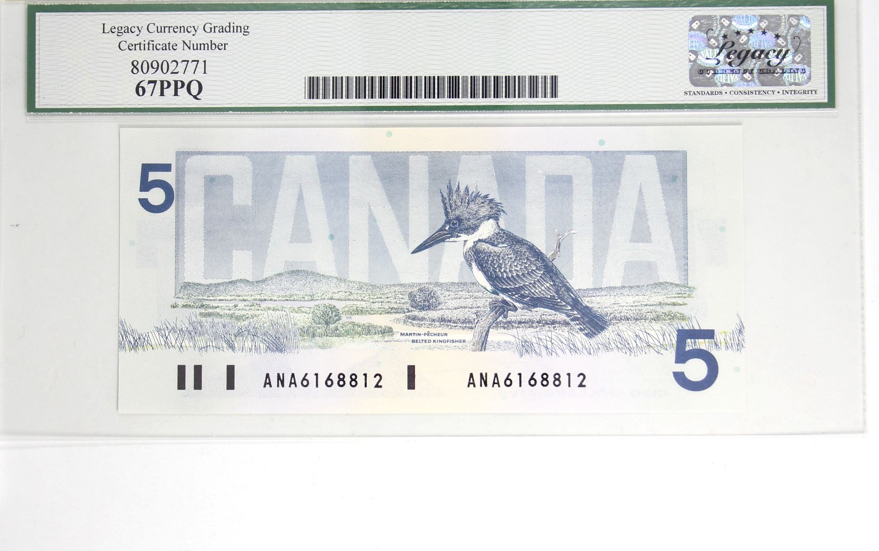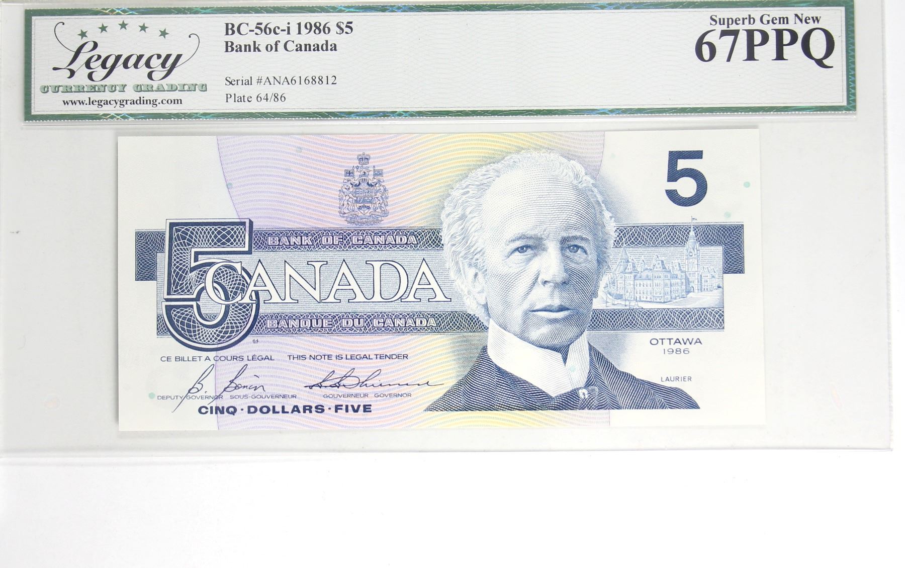 BC-56C-i 1986 Canada $5, Bonin-Thiessen, SN:ANA6168812, Legacy Grading Certified Banknote in Superb Gem New-67 PPQ Condition.