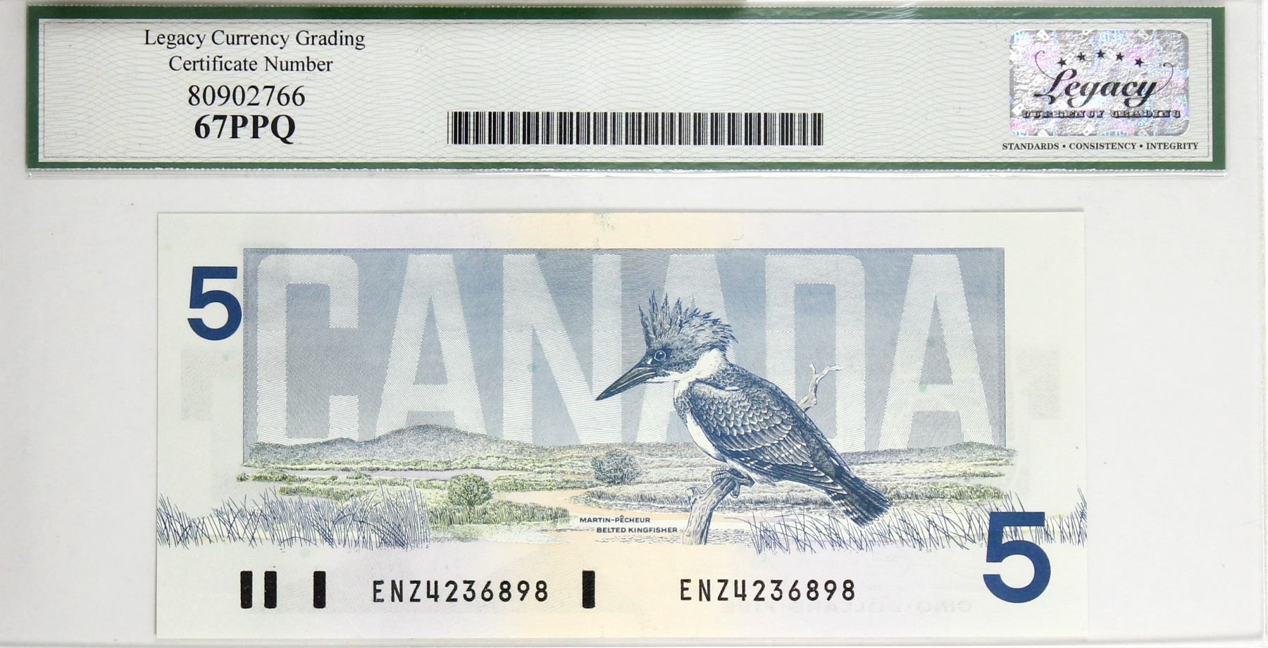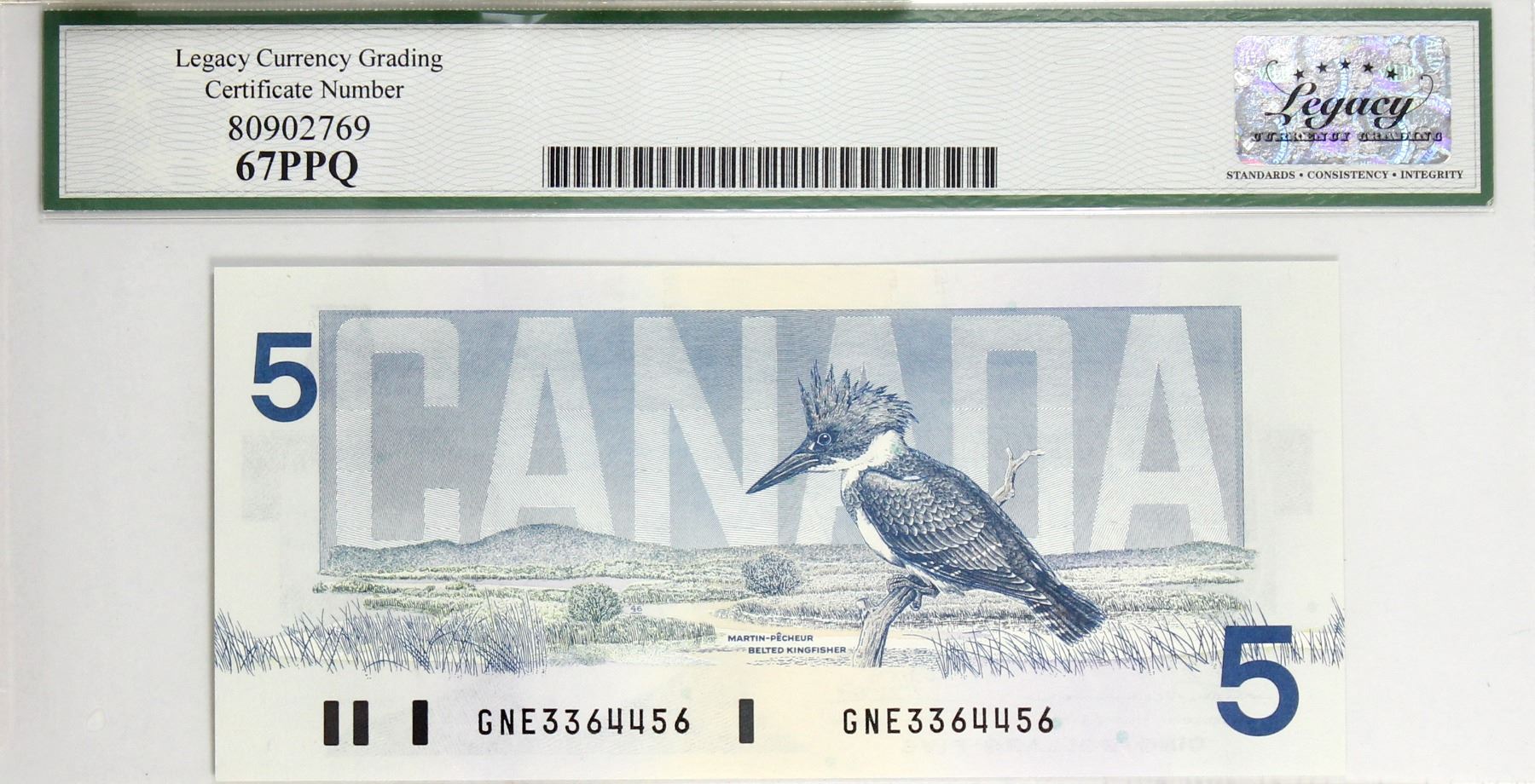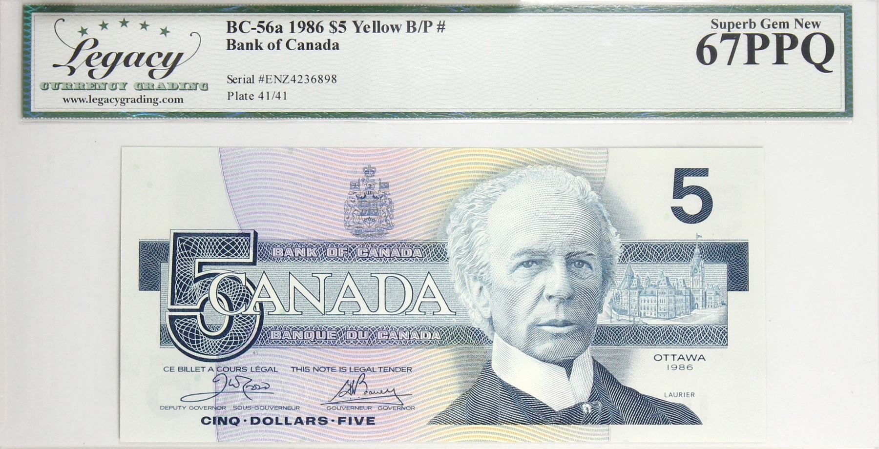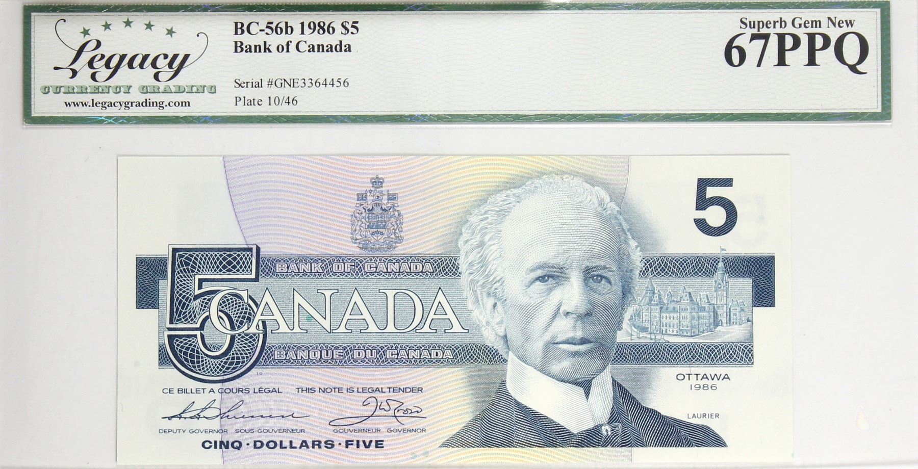 BC-56a & BC-56b 1986 Bank of Canada $5, Thiessen-Crow GNE Prefix & Crow-Bouey ENZ Prefix Both Legacy Certified Superb GEM NEW-67 PPQ! (2pc)