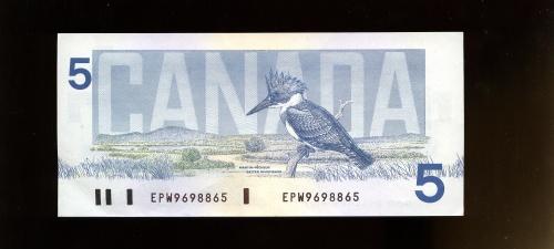 BC-56a-i 1986 $5 EPW9698865 Crow-Bouey with the blueplate. AU with light writing in the lower margin on the reverse. Believe to be the only one known so far. Excessiviel rare and first one seen by the cataloguer. Expect strong bidding on this rarity.