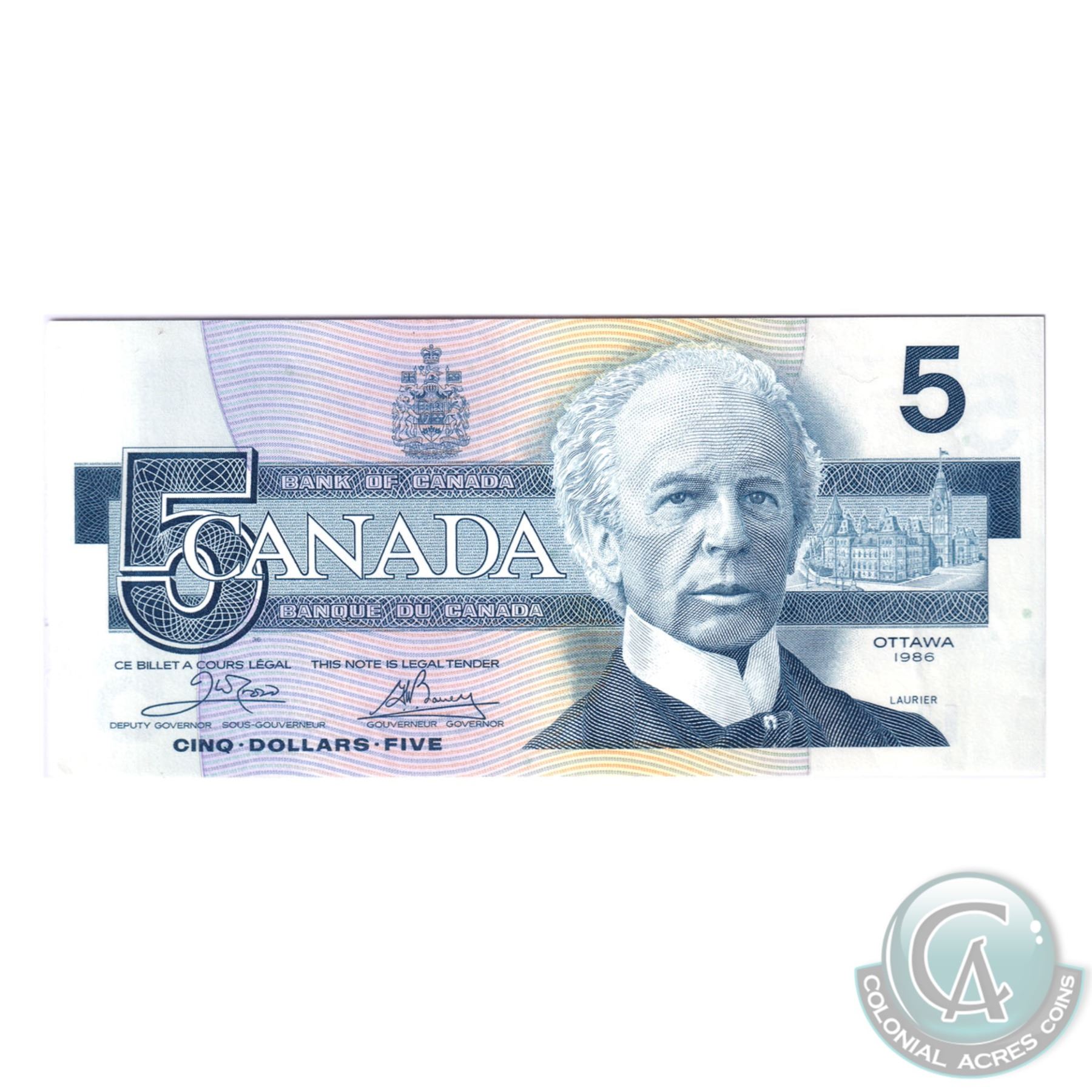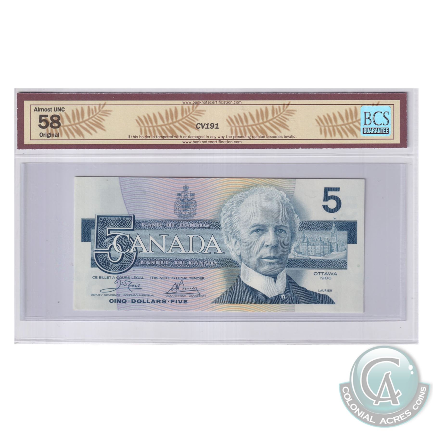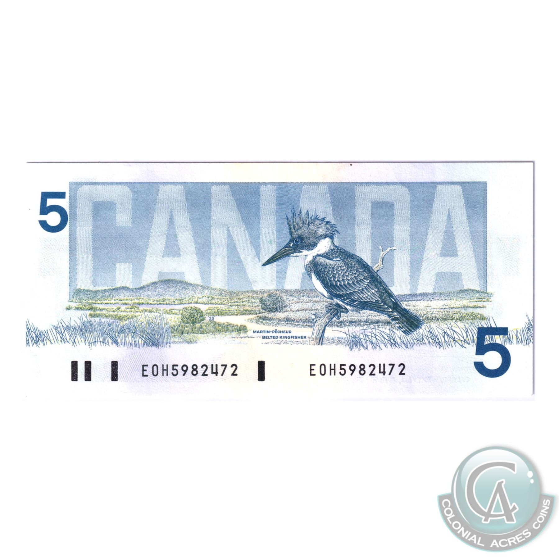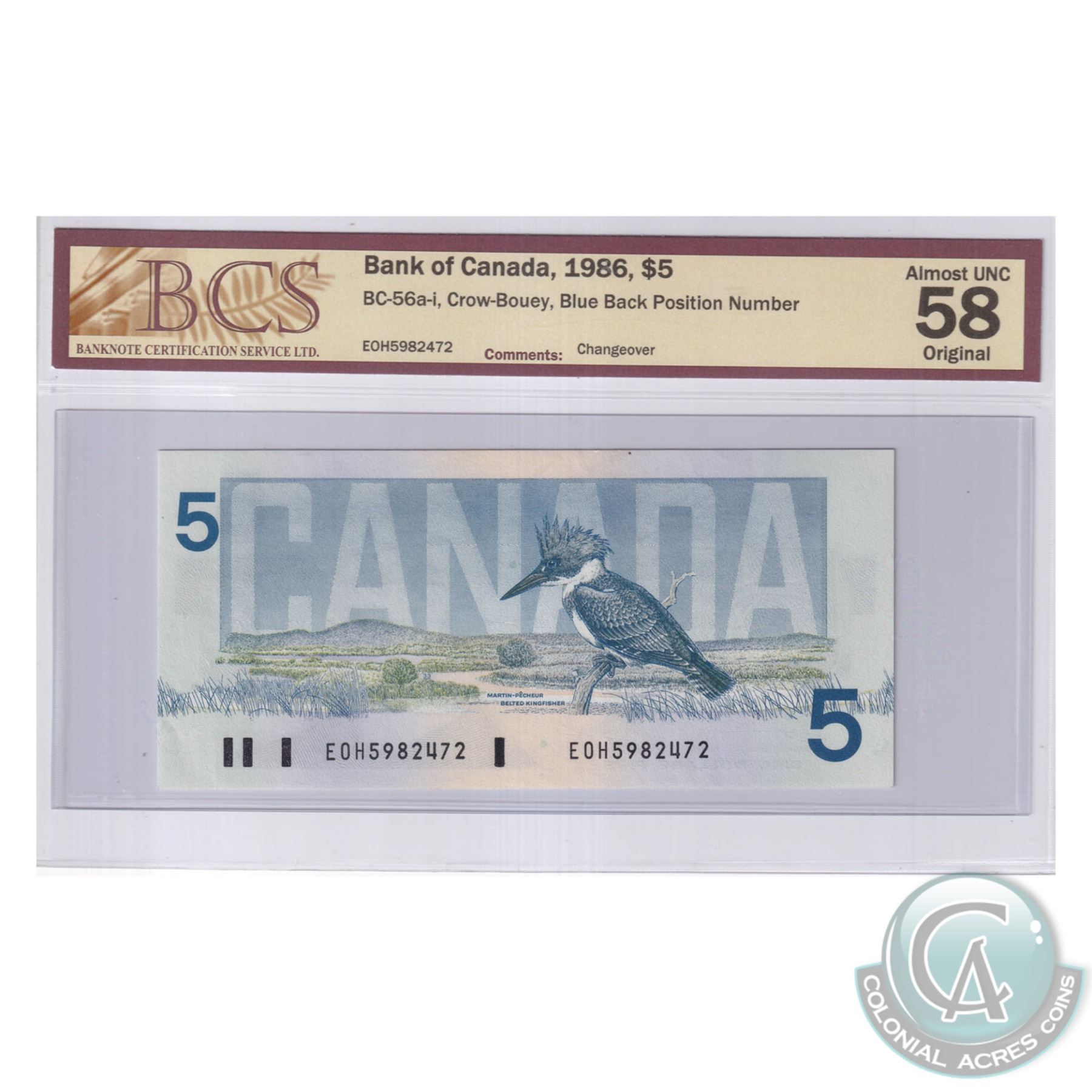 BC-56a-i 1986 Bank of Canada $5, Crow-Bouey, S/N: EOH5982472, Blue Back position number. BCS Certified AU-58 Original.