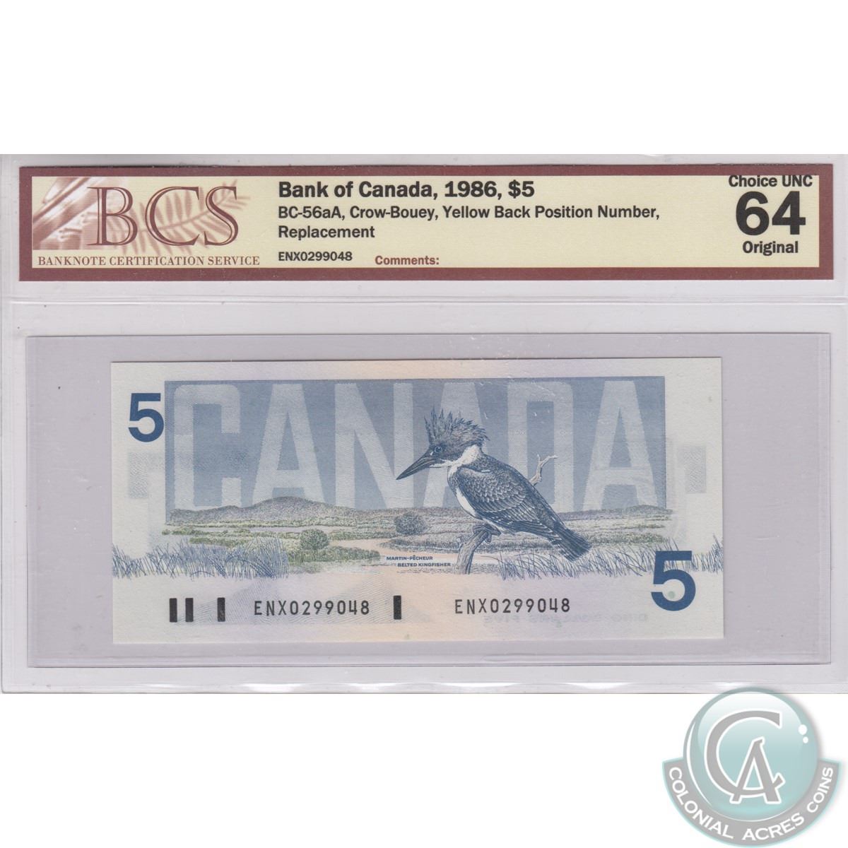BC-56aA. 1986 Bank of Canada $5 Yellow Back Position Number, Replacement, Crow-Bouey, ENX0299048, BCS CUNC-64 Original