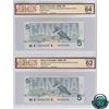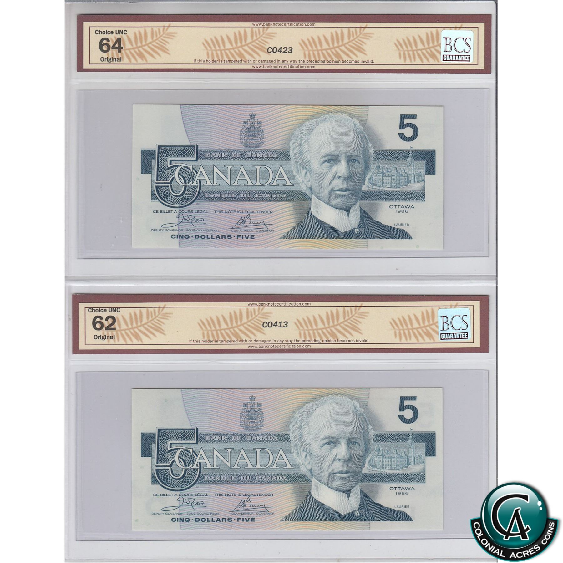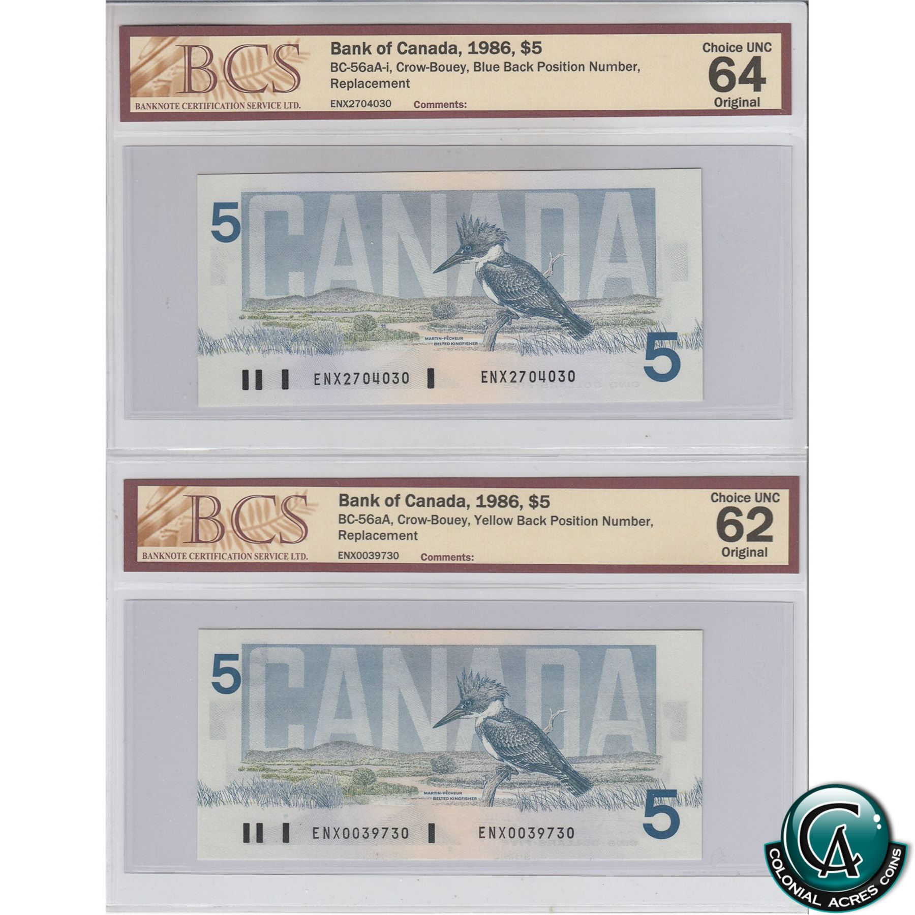 BC-56aA & BC-56aA-i 1986 Bank of Canada Replacement $5, Lot includes a Yellow and Blue Back position number. Crow-Bouey S/N: ENX0039730 & ENX2704030. Both BCS Certified CUNC-62 & CUNC-64 Original.