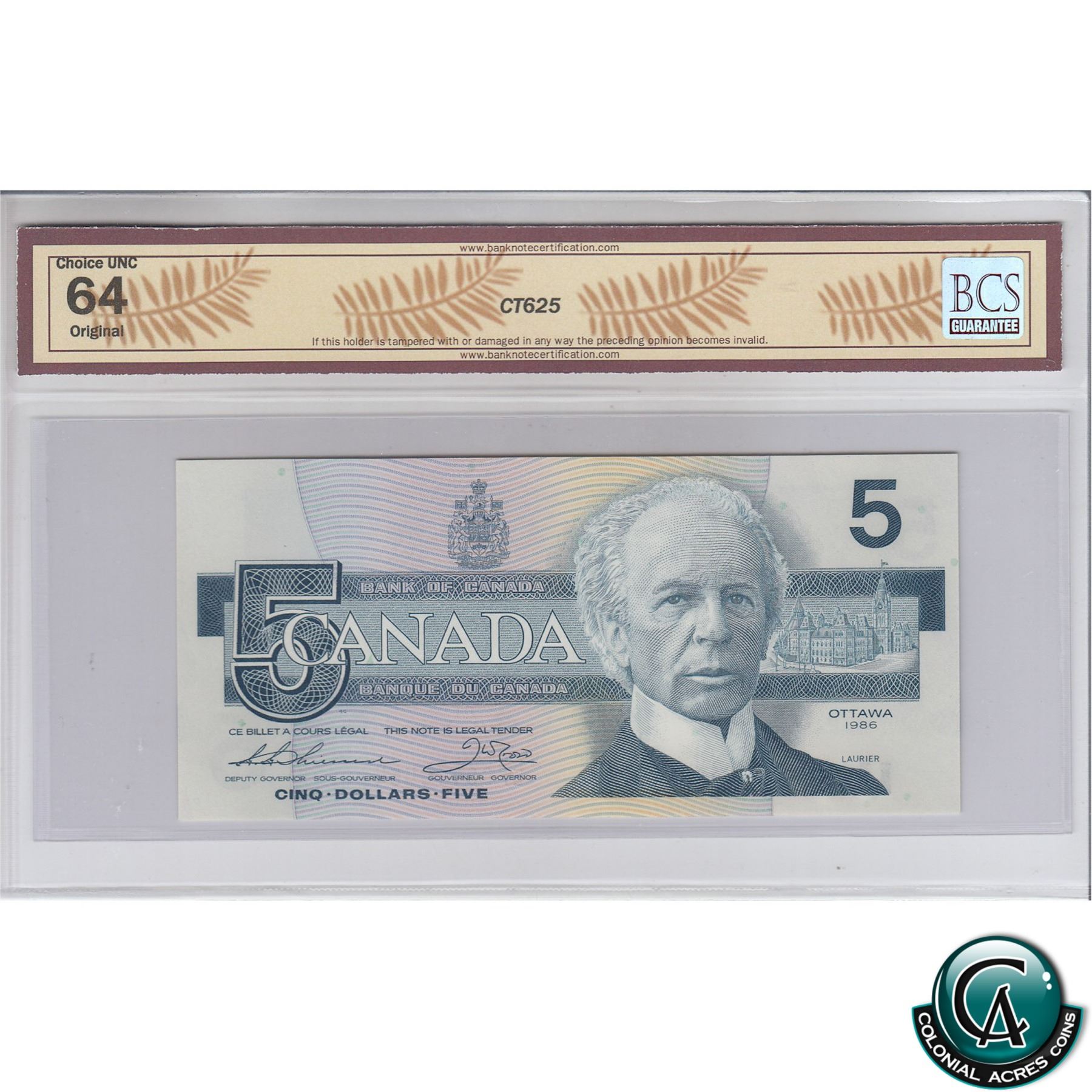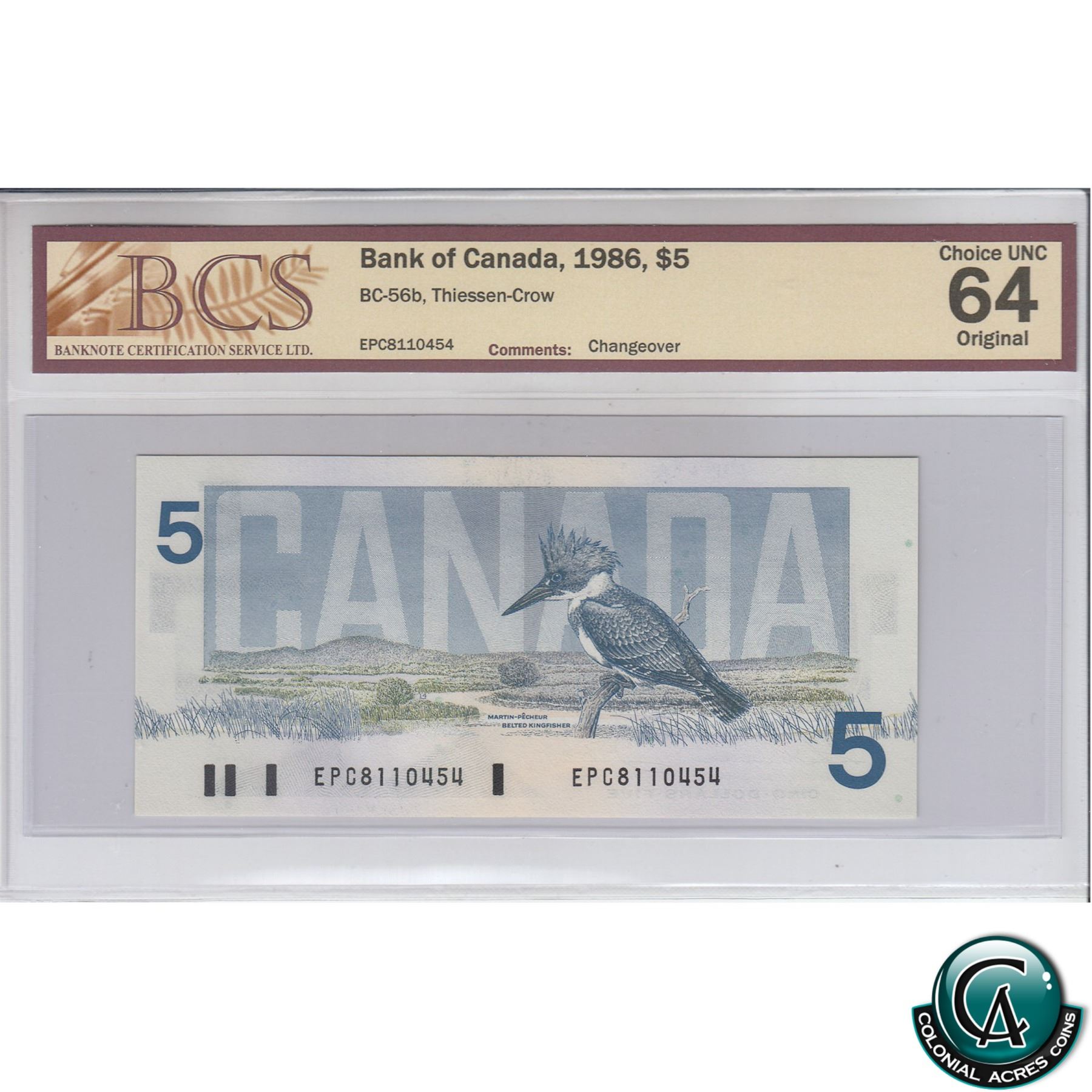 BC-56b 1986 Bank of Canada $5, Changeover, Thiessen-Crow, S/N: EPC8110454 BCS Certified CUNC-64 Original.