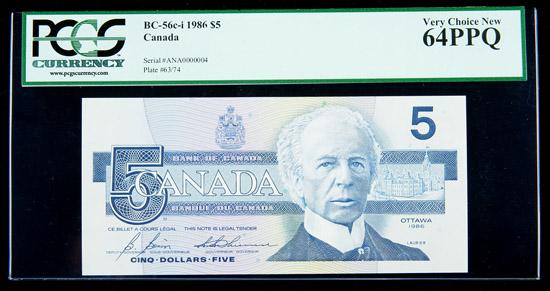 BC-56c-i 1986 $5. Very Choice New 64PPQ. Serial number ANA0000004, the first of two consecutive.