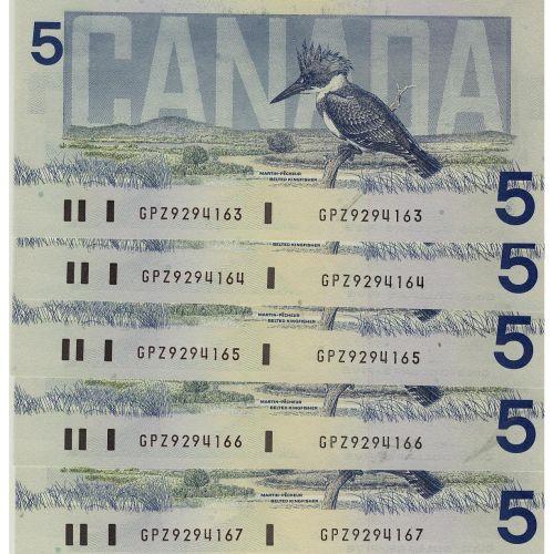 BC-56eA 1986 $5 Between 9.00m and 9.78m. Lot of 5 consecutive notes all Gem UNC