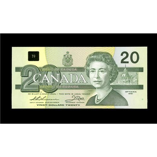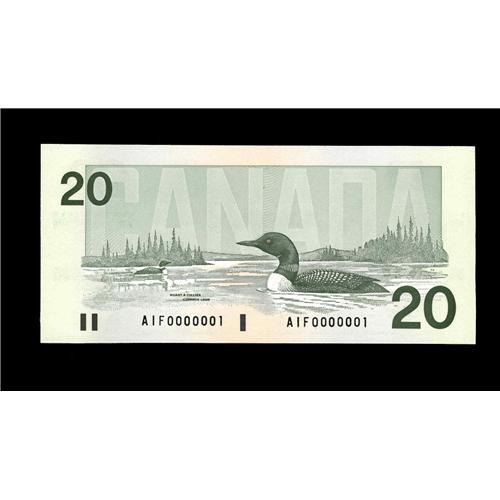 <B>BC-58a-ii $20 1991 Gem Crisp Uncirculated</B></I> This is a gem example of the striking reverse design of the "common loon," or in Quebec, the "huart a collier." It comes with the addition of serial number AIF0000001.