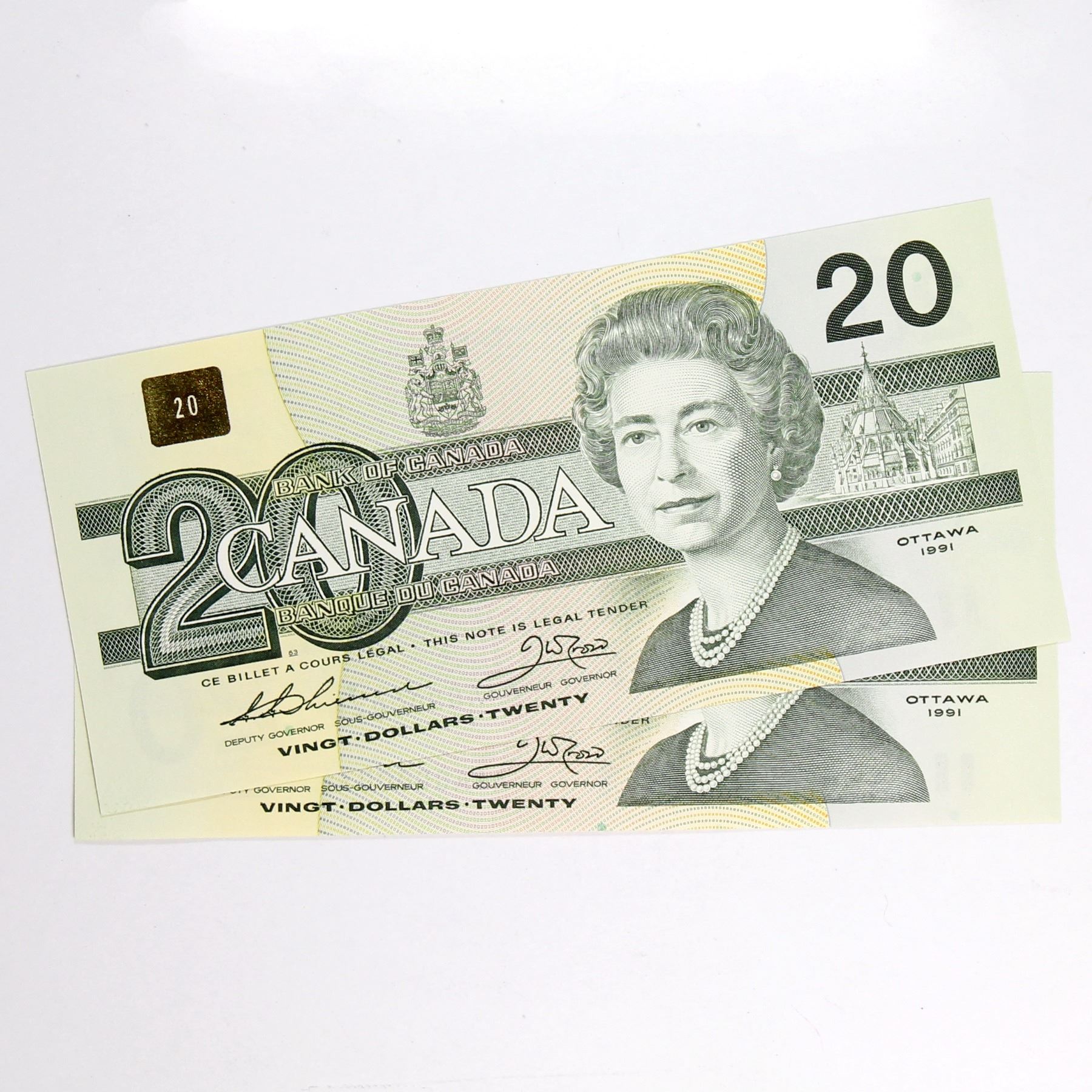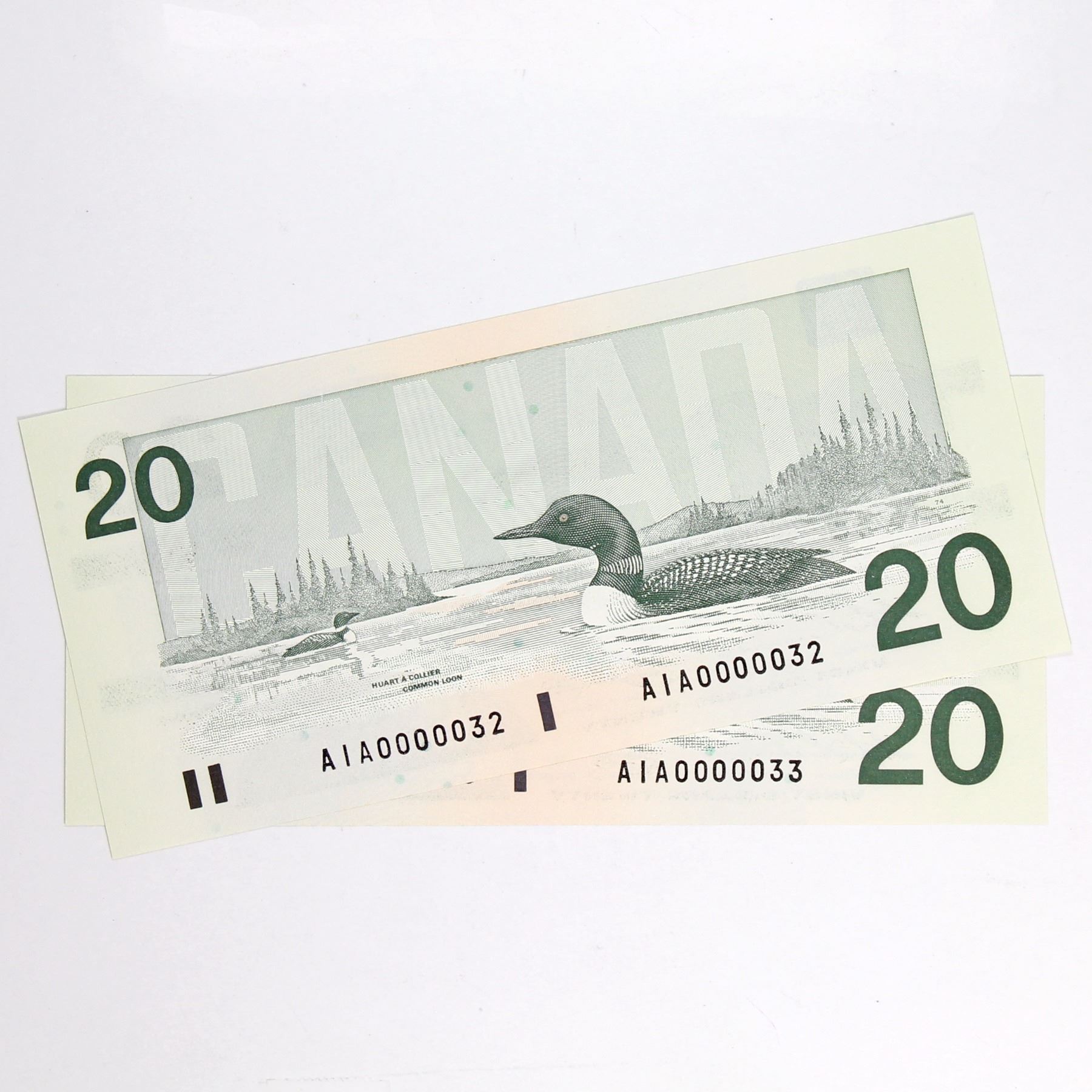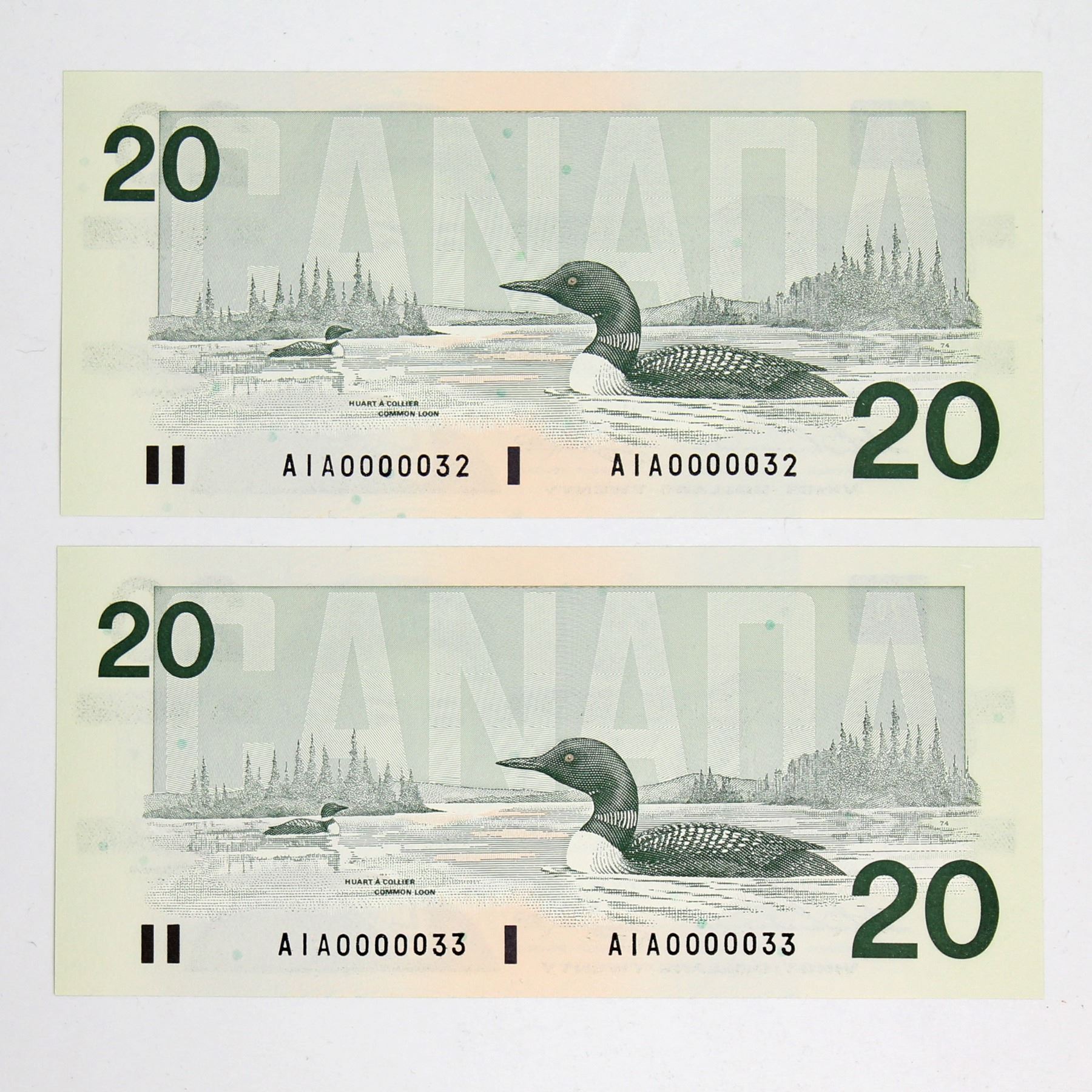 BC-58a-ii-N5-iii 2x consecutive 1991 Bank of Canada, $20 Low Serial # Thiessen-Crow, S/N: AIA0000032/33. Both Notes are a Clean AU-UNC.
