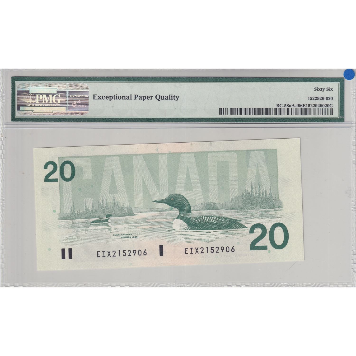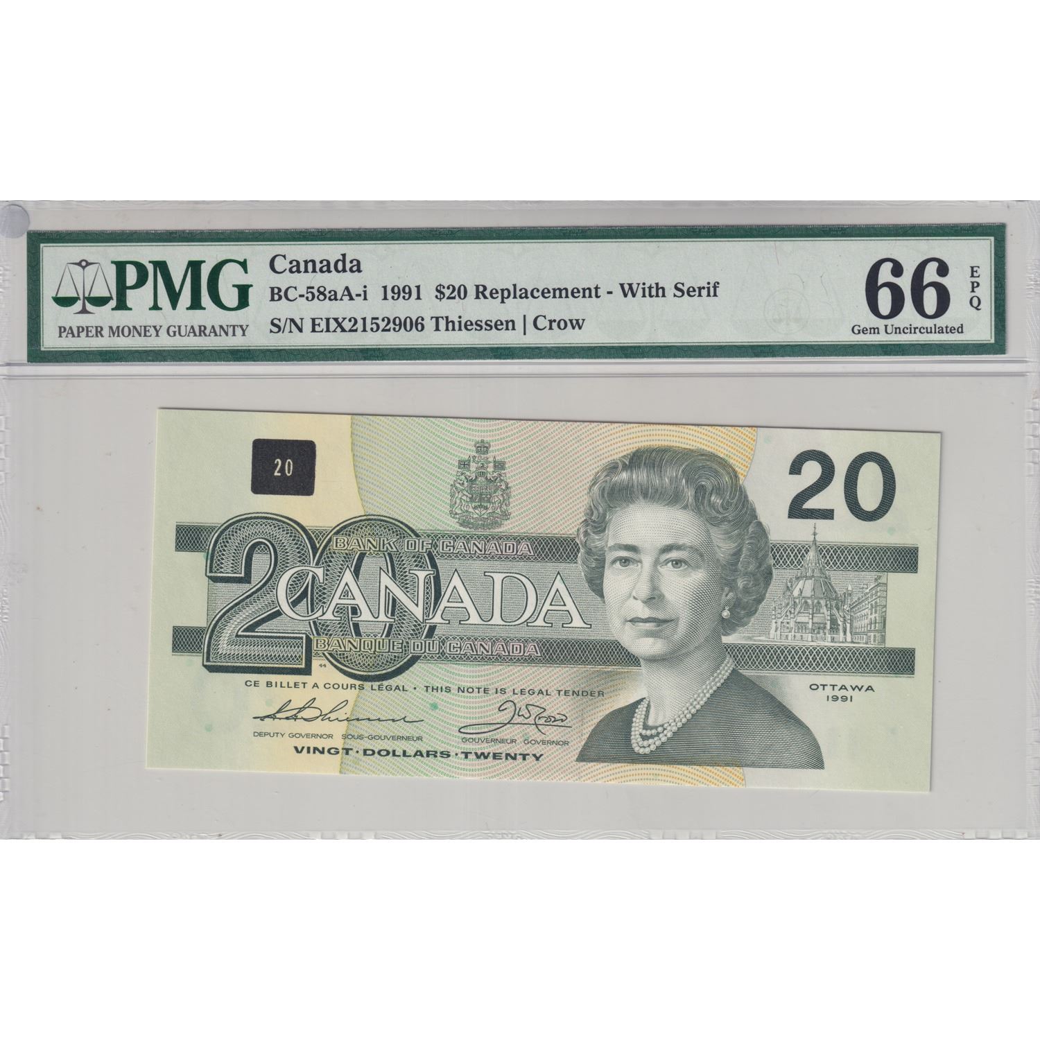 BC-58aA 1991 Canada $20, Thiessen-Crow, Replacement-With Serif, SN: EIX2152906, PMG Certified Gem UNC-66 EPQ