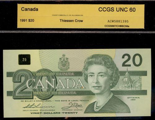 BC-58aiii 1991 $20 AIW5881395 with serifs "CCGS UNC60". A very scarce prefix note missing in most advanced collections.