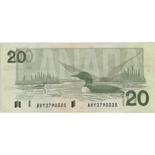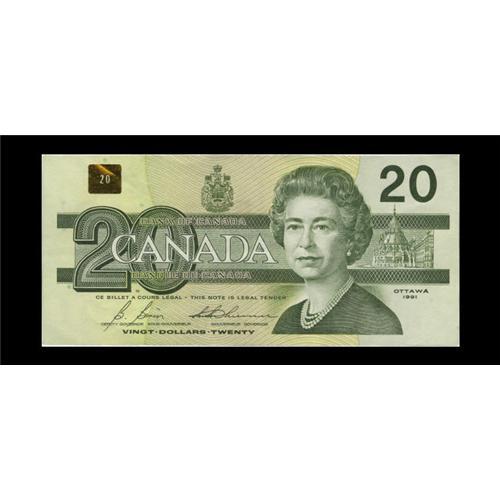 <B>BC-58b/BC60a $20/$100 1991 About Uncirculated.</B></I> This piece is as close as any collector can get to owning a Canadian double denomination note, which, as the Charlton catalogue states, is a "type of error that has not been confirmed for a Canadian note." On this example the face is a normal $20 example, but the back shows two distinct printings. The first printing is a $100 printing in pale beige ink, and the second printing is a normal $20 printing in green ink. If this were a United States double denomination error, we would likely be estimating this error in the range of $25,000 to $50,000, but for a Canadian note the likeliest realization will probably be in the area of...