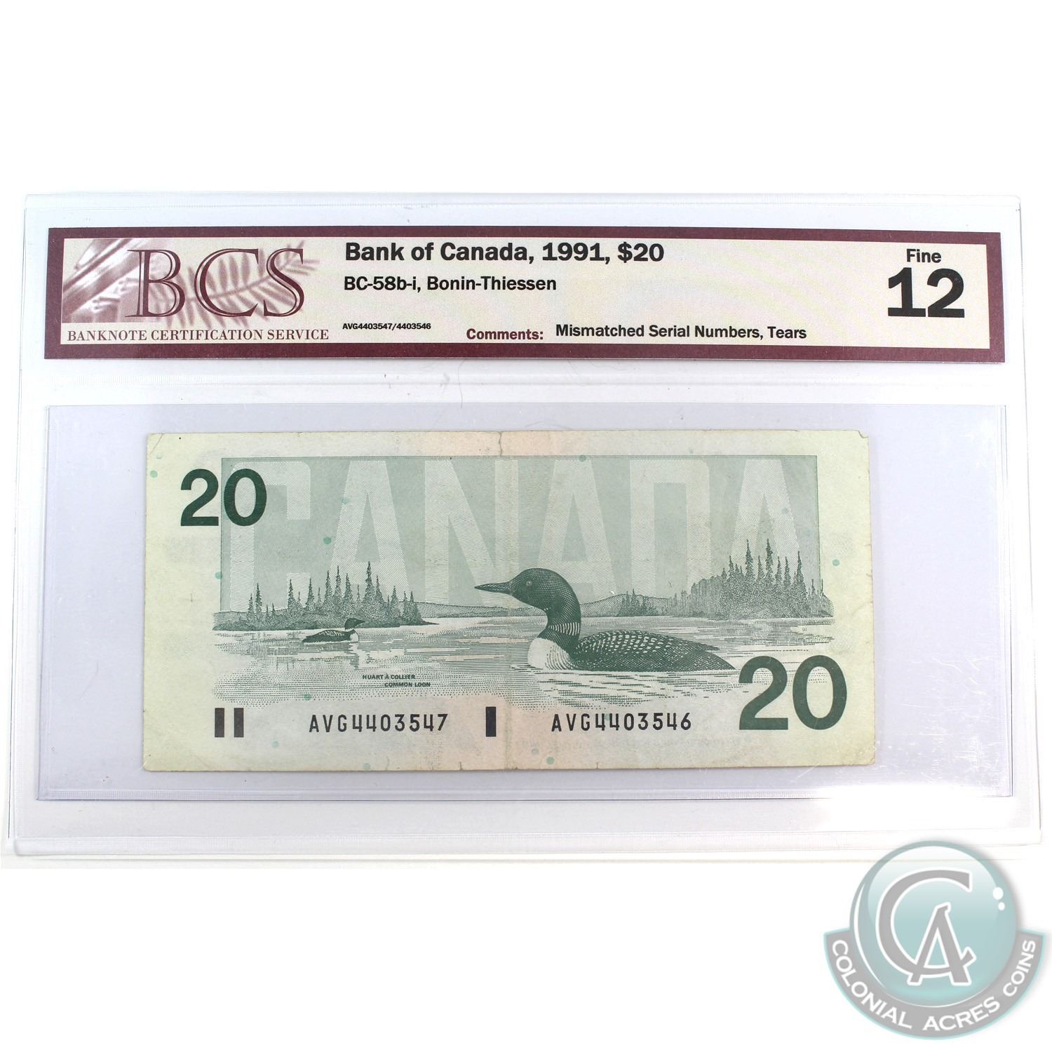 BC-58b-i 1991 Bank of Canada $20 Bonin-Thiessen, MISMATCHED SERIAL NUMBERS BCS Certified F-12. Tears , Serial # AVG4403547 / AVG4403546