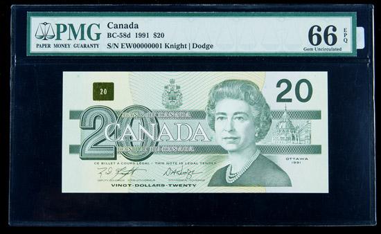 BC-58d 1991 $20. PMG Gem Uncirculated 66EPQ. Serial number EWO0000001.
