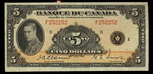 BC-6 1935 $5 French text RADAR NOTE F252252 Nice and clean VF+. Radar notes are seldom seen on 1935 issues. Rare and attractive.