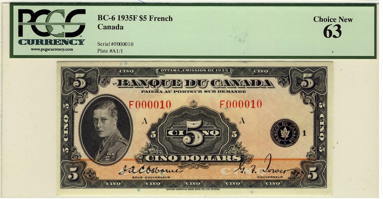 BC-6 $5 1935 French F000010 PCGS Choice New 63, a rare French LOW SER Numbers in Choice condition.