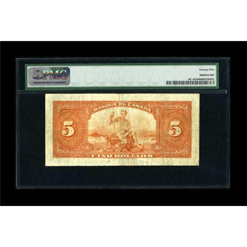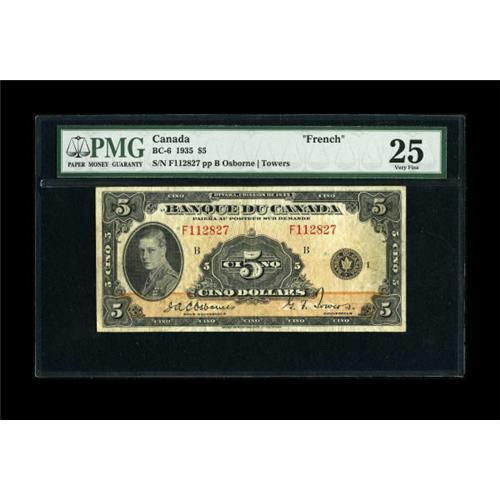 <B>BC-6 $5 1935</B></I><BR> This colorful French text note has been graded <B>PMG Very Fine 25</B></I>.<BR><BR><b>Shipping:</b> Coins & Currency (<a target="_blank" href="http://www.heritageauctions.com/common/shipping.php">view shipping information</a>)